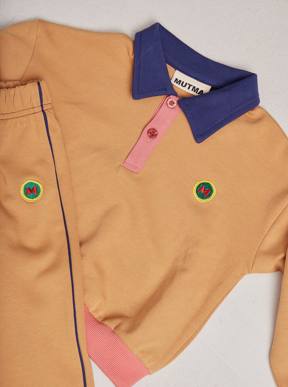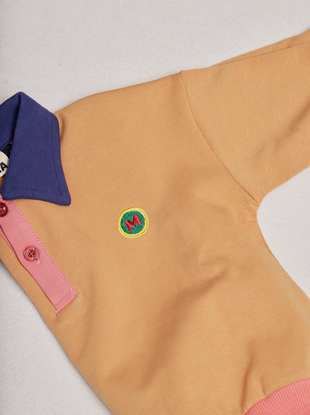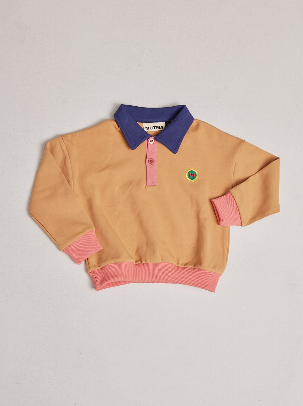 remera de manga larga con cuello camisero y plaqueta de tres botones en el frente, a juego con puños de bajo y mangas. en el pecho, M bordada en tipografía retro, la insignia de los MUTMAkids.