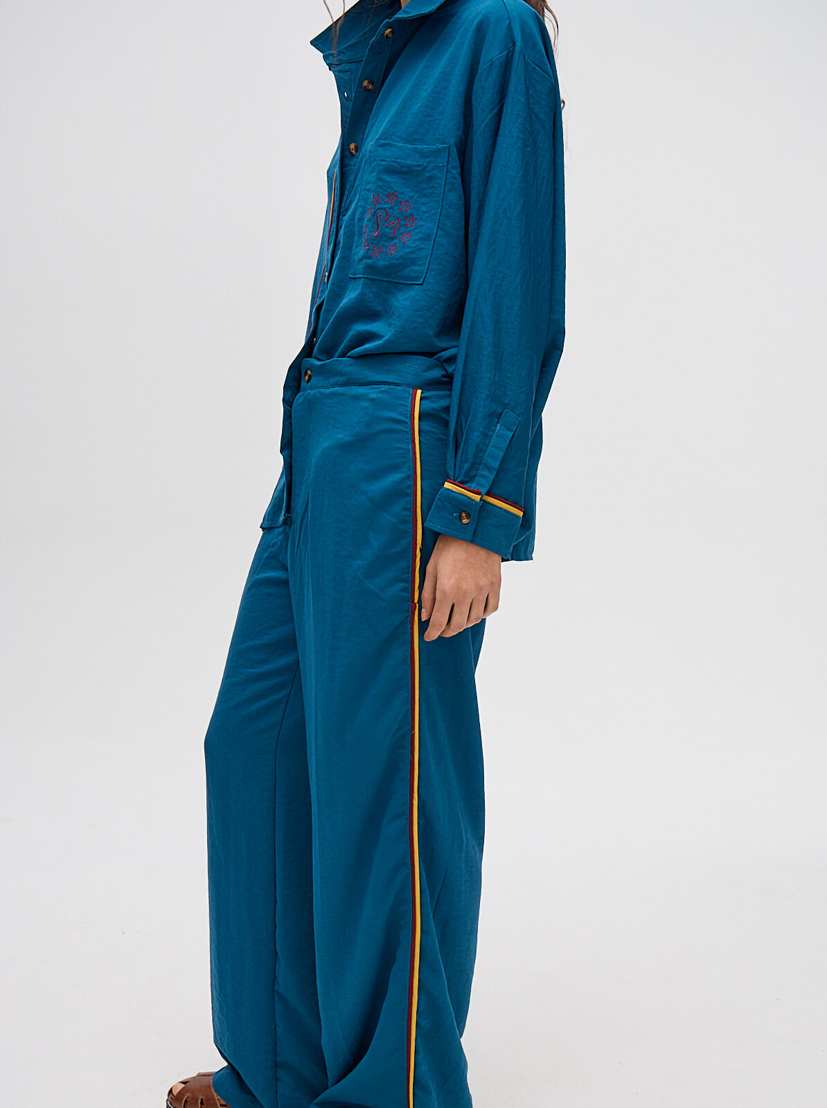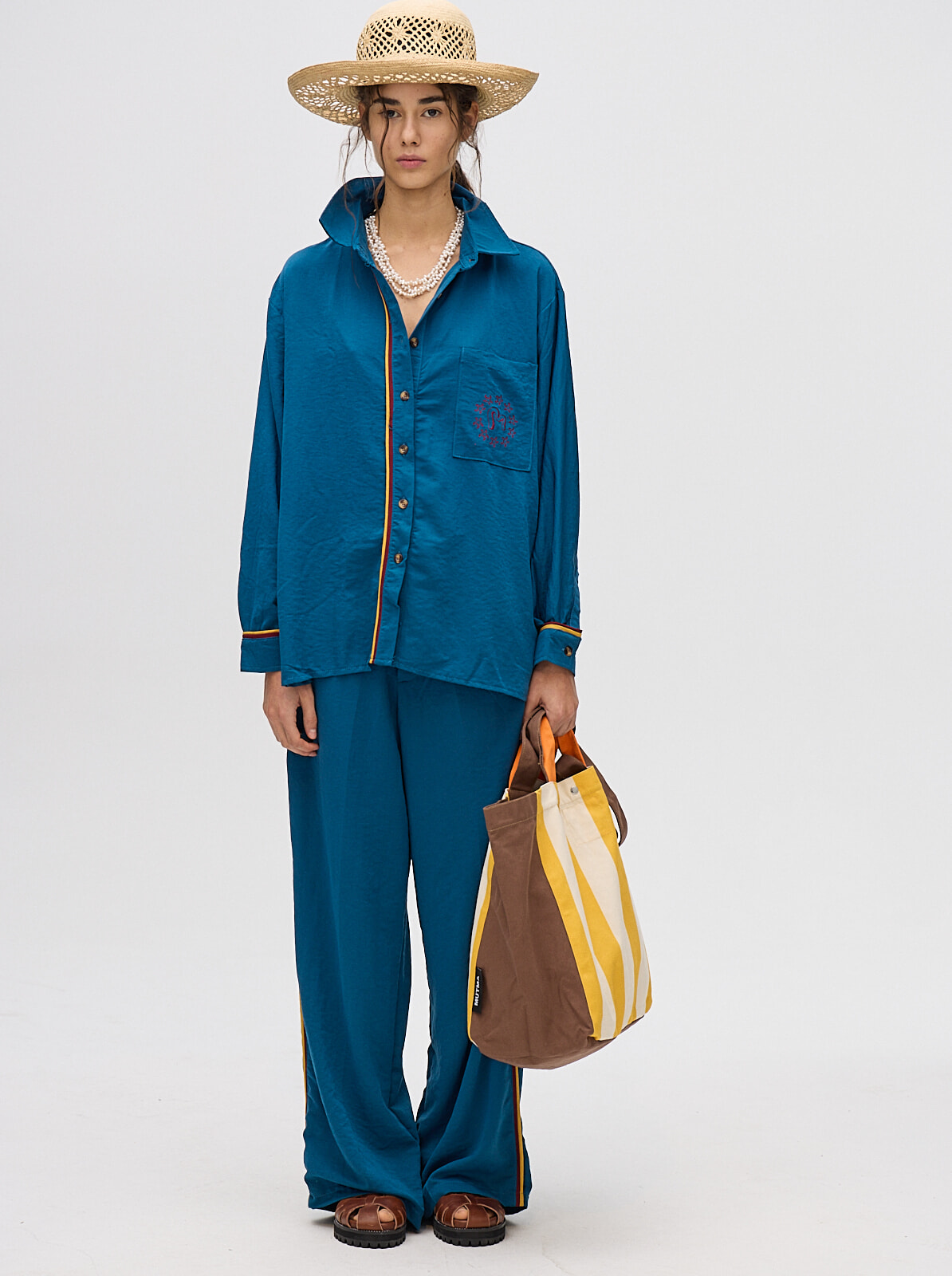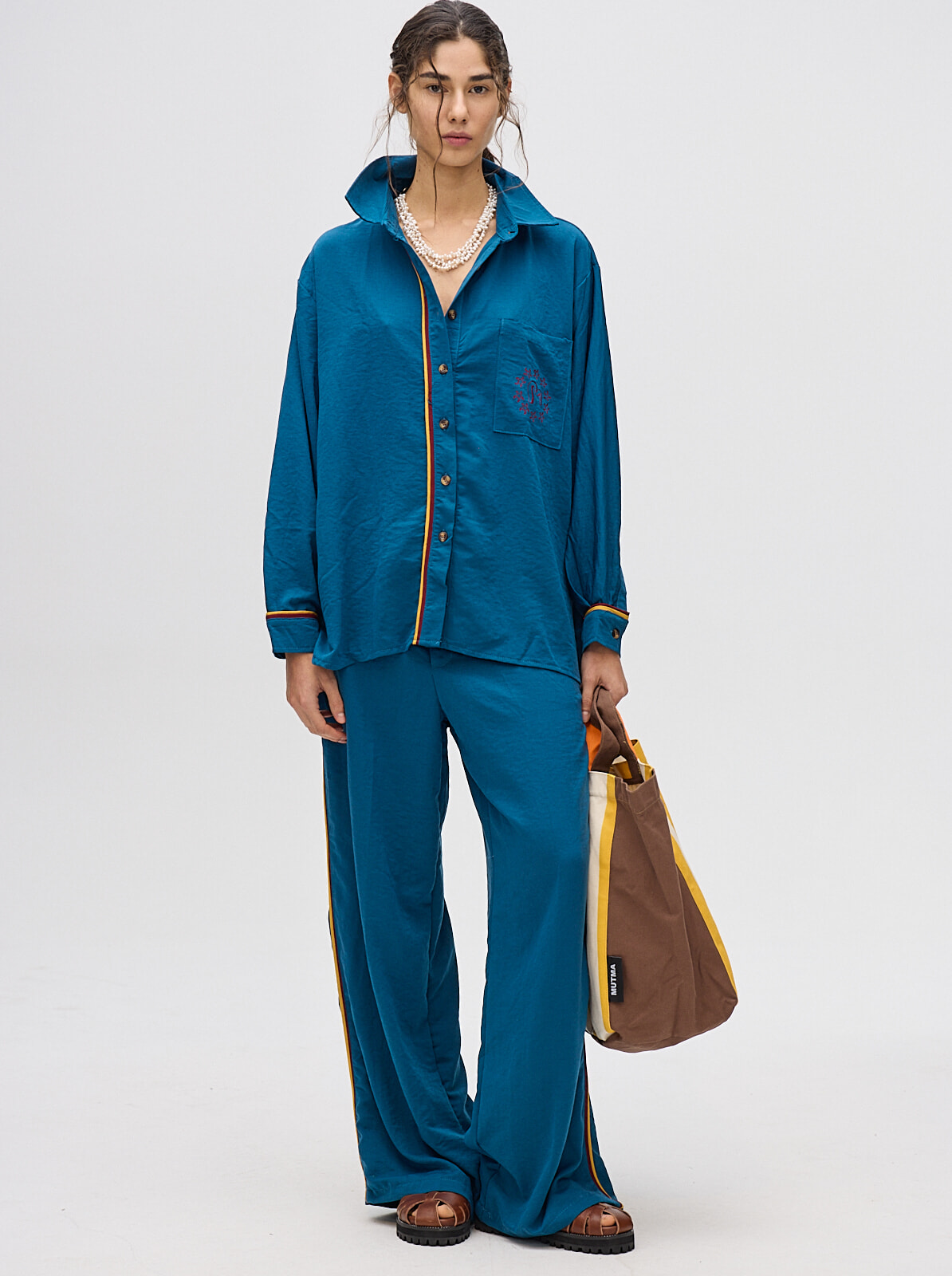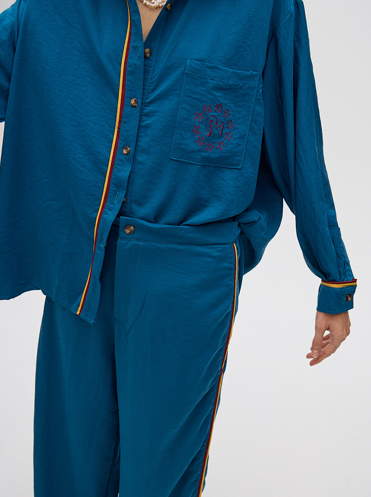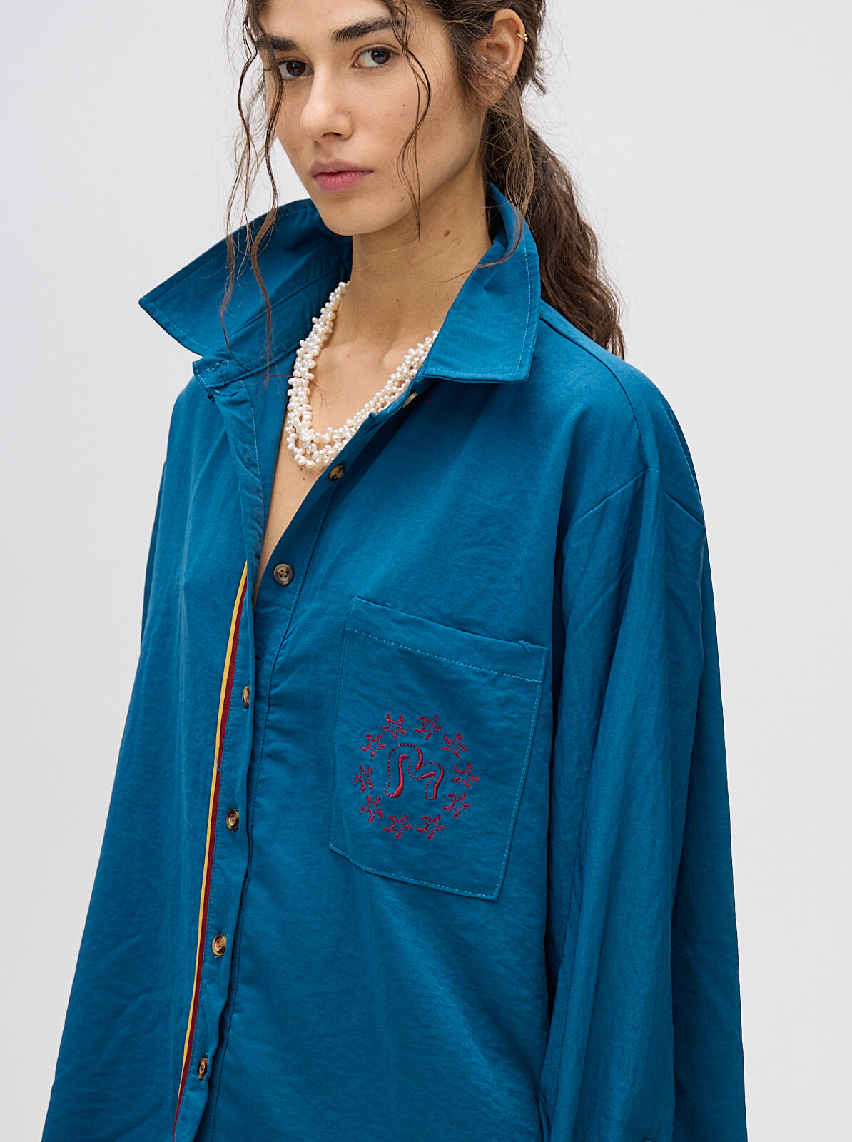 la camisa campa tiene un corte holgado, con el detalle de diseño en cartera de botones y puños. logo MUTMA bordado en el bolsillo cuadrado, en la parte de adelante.