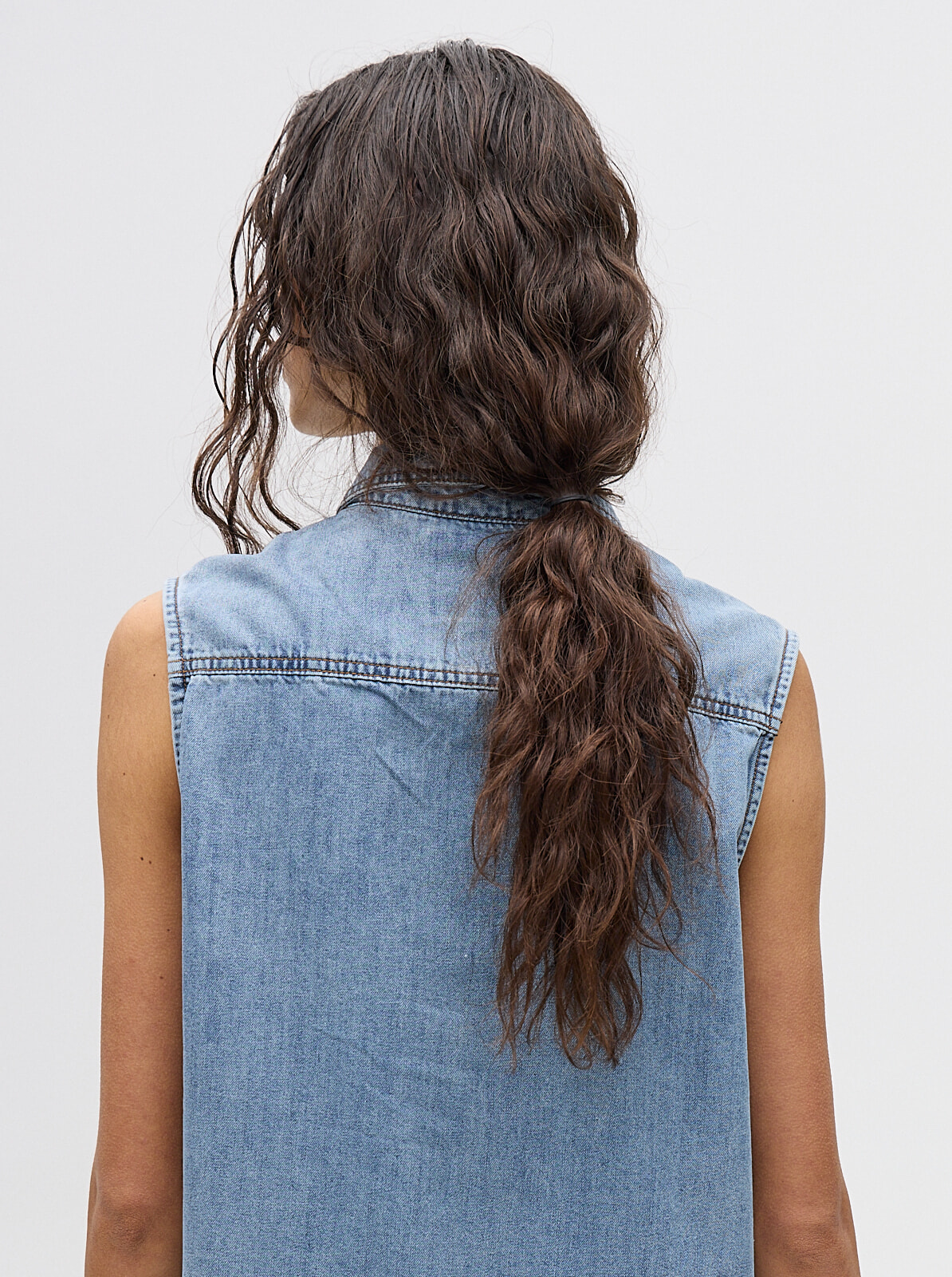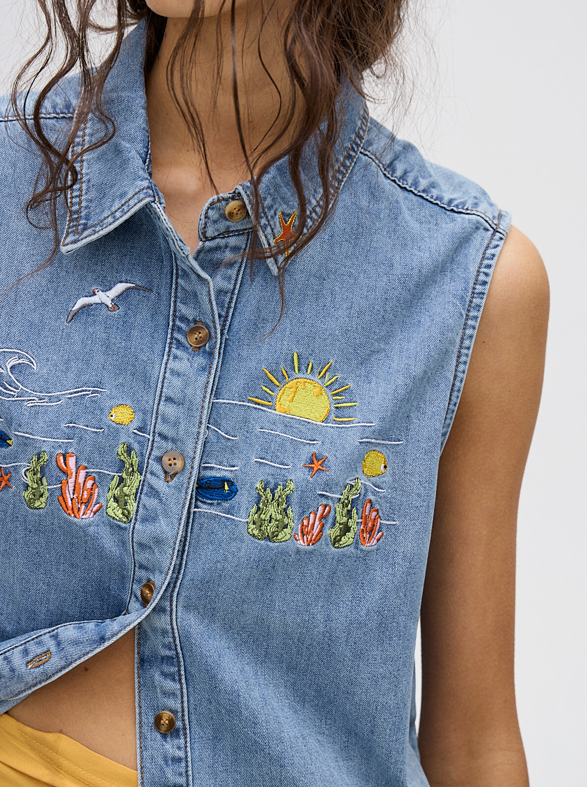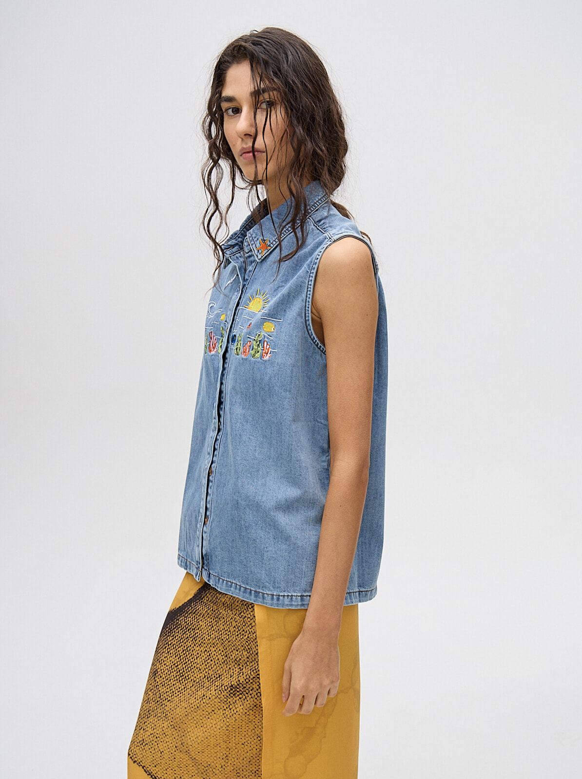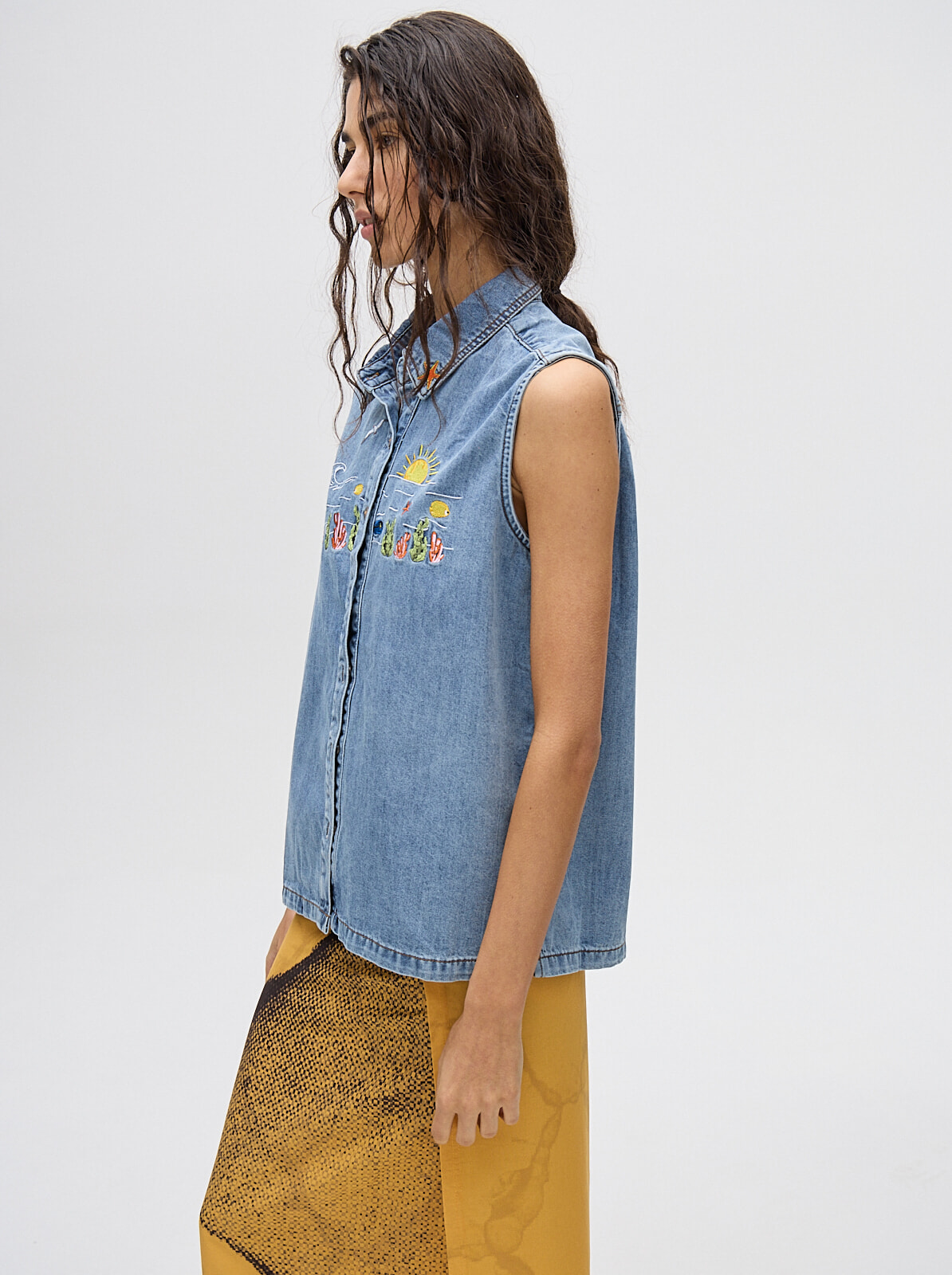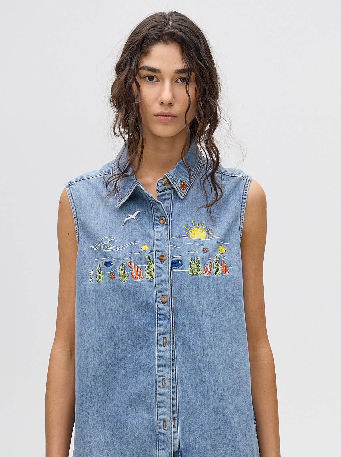camisa musculosa en denim liviano, con bordados en pecho y cuello de camisa diseñados por nosotras. confeccionada en denim algodón, talles del s al l