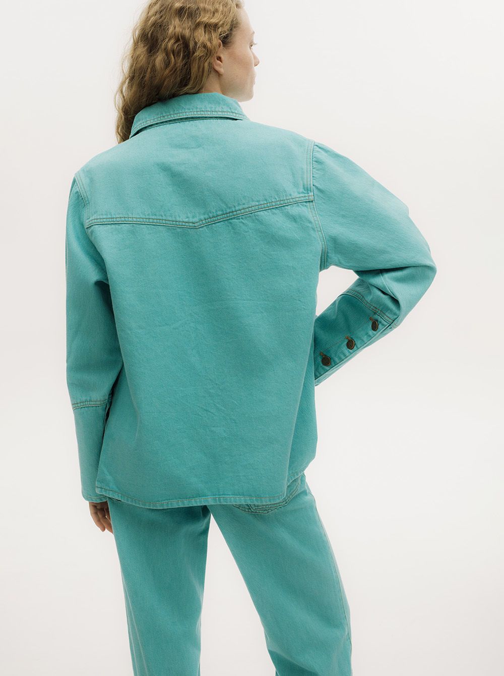 denim gastado, cuello camisero y corte favorecedor, es una campera liviana e ideal para las noches veraniegas. canesú con costuras delante y atrás. sobre el final de la manga, hilera de botones que combinan con los del jean MUTMA sualado.