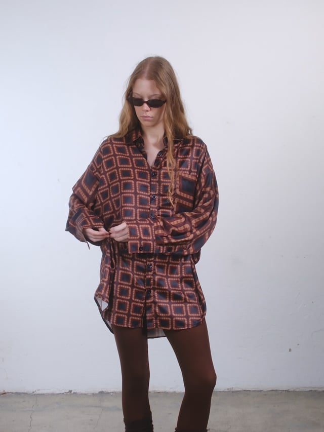 camisa confeccionada en seda, suave al tacto y caída ligera. estampas a juego en bolsillo del pecho, cuello camisero y mangas.