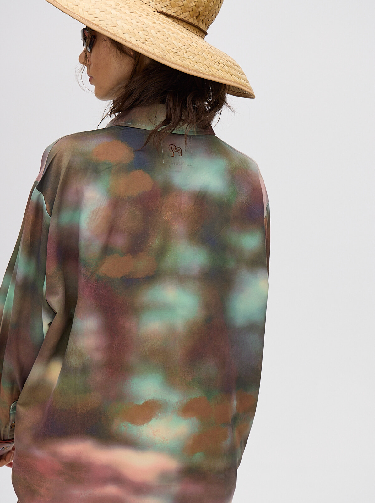 camisa oversize confeccionada en viscosa, liviana y fresca para el verano. diseños únicos y de autor. terminada con bolsillo cuadrado en el frente.