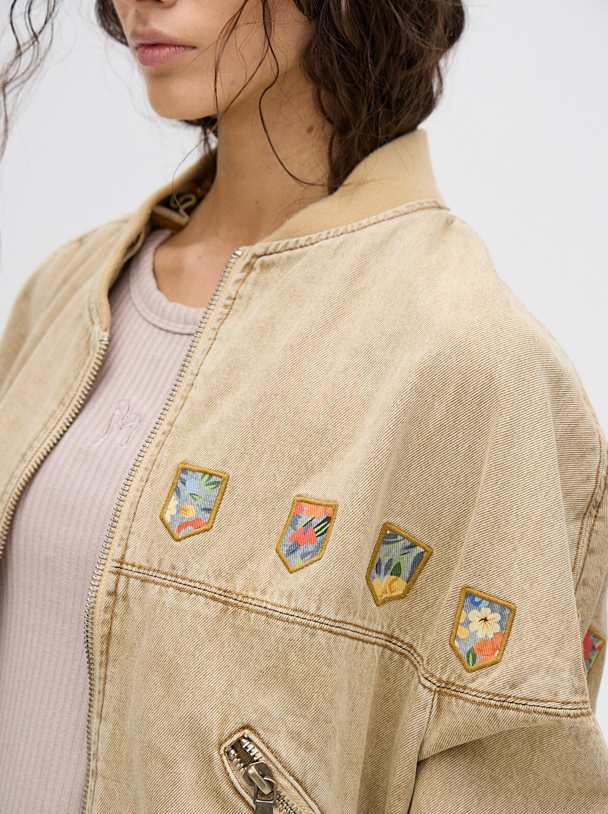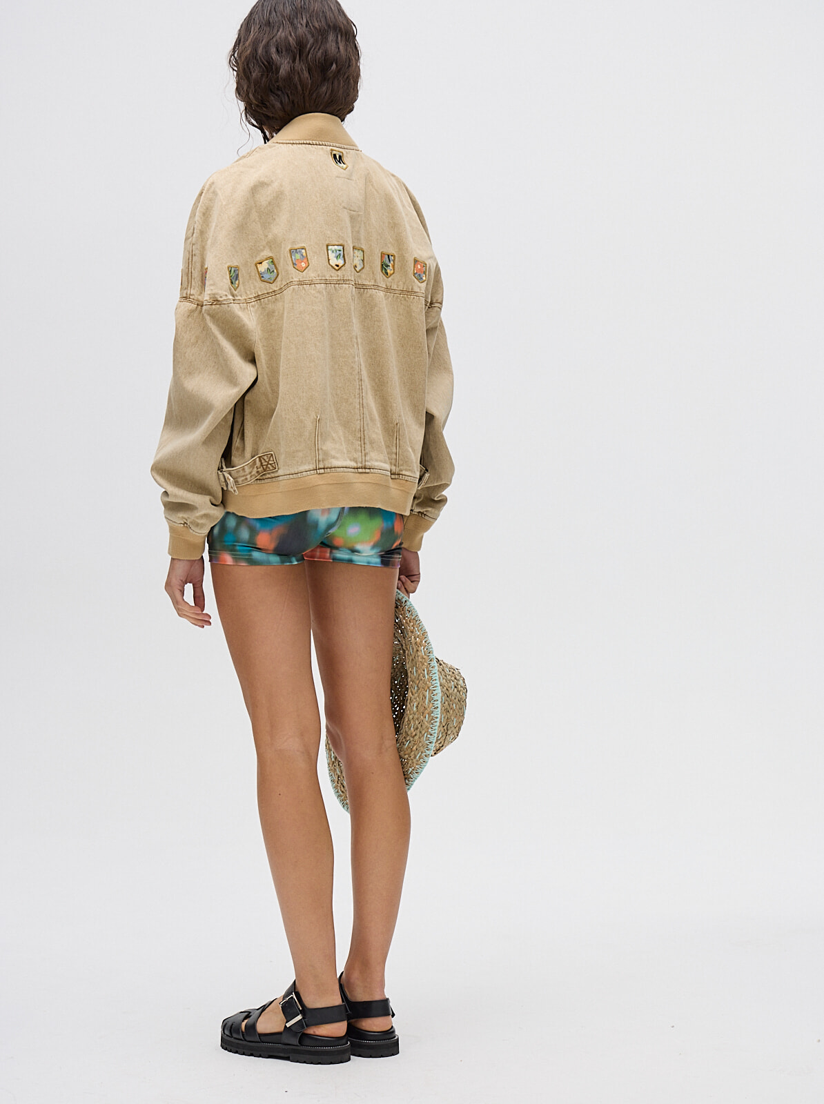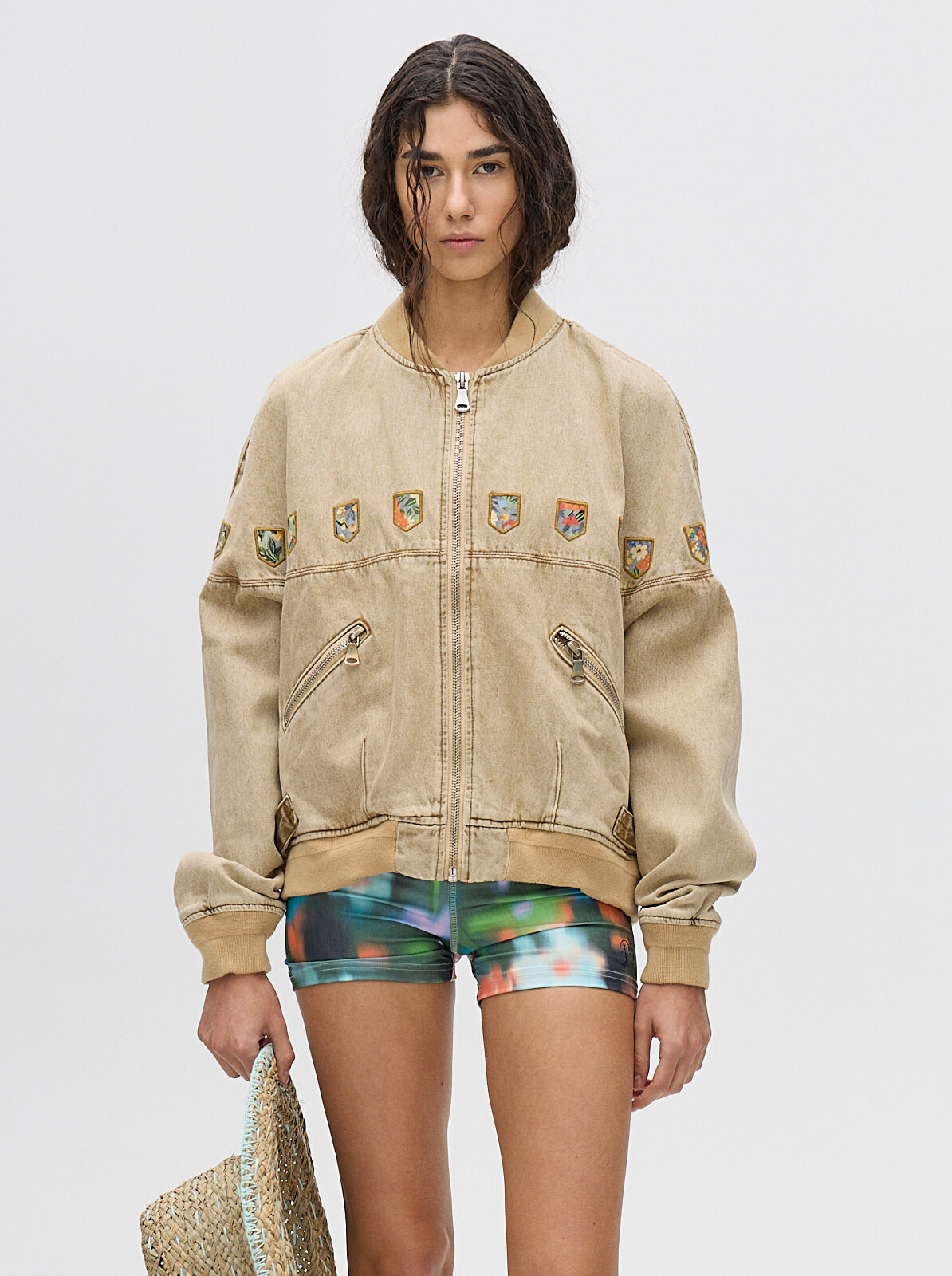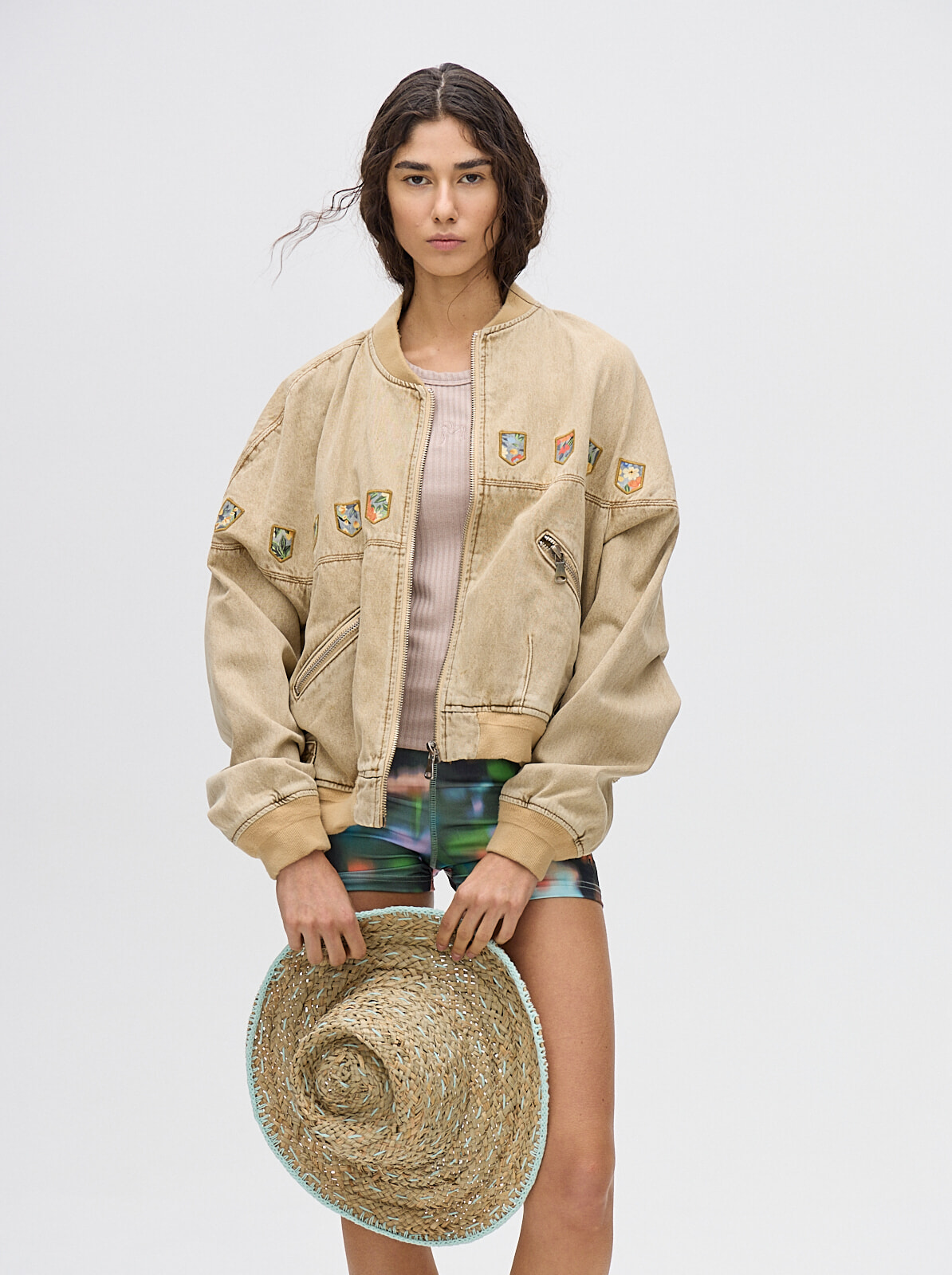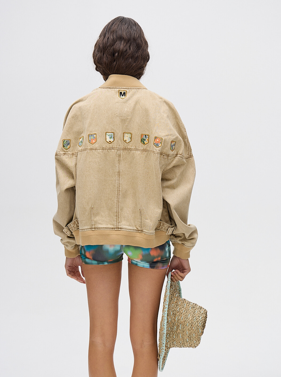 campera bomber MUTMA celica, confeccionada en denim algodón con cierres metálicos y detalles de diseño en la parte delantera.