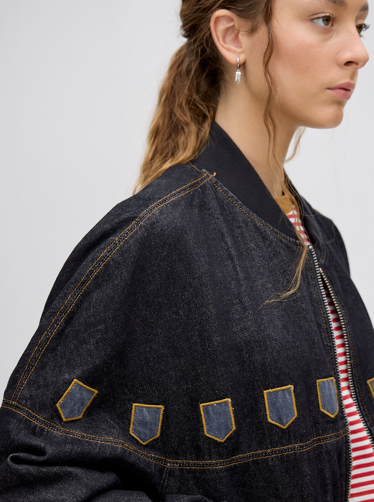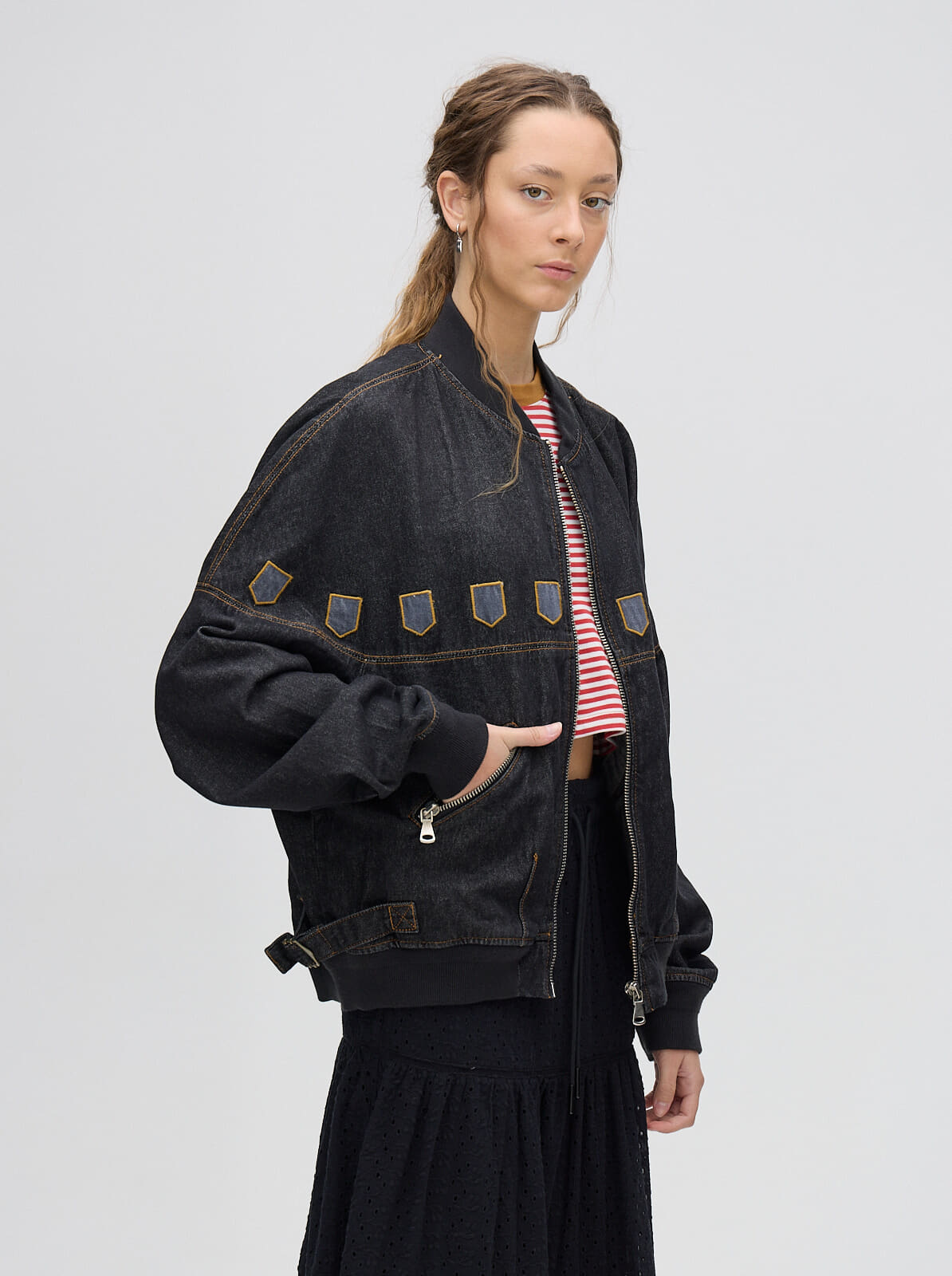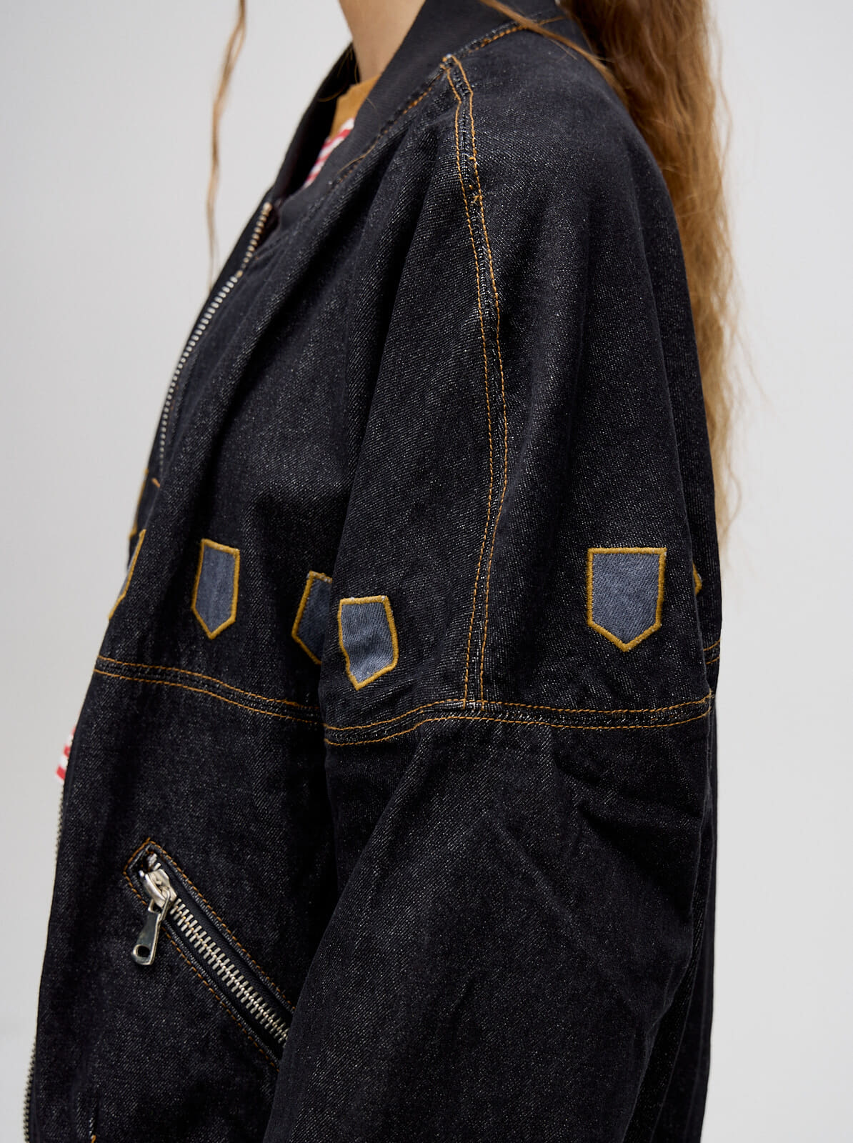 campera bomber MUTMA celica, confeccionada en denim algodón con cierres metálicos y detalles de diseño en la parte delantera.