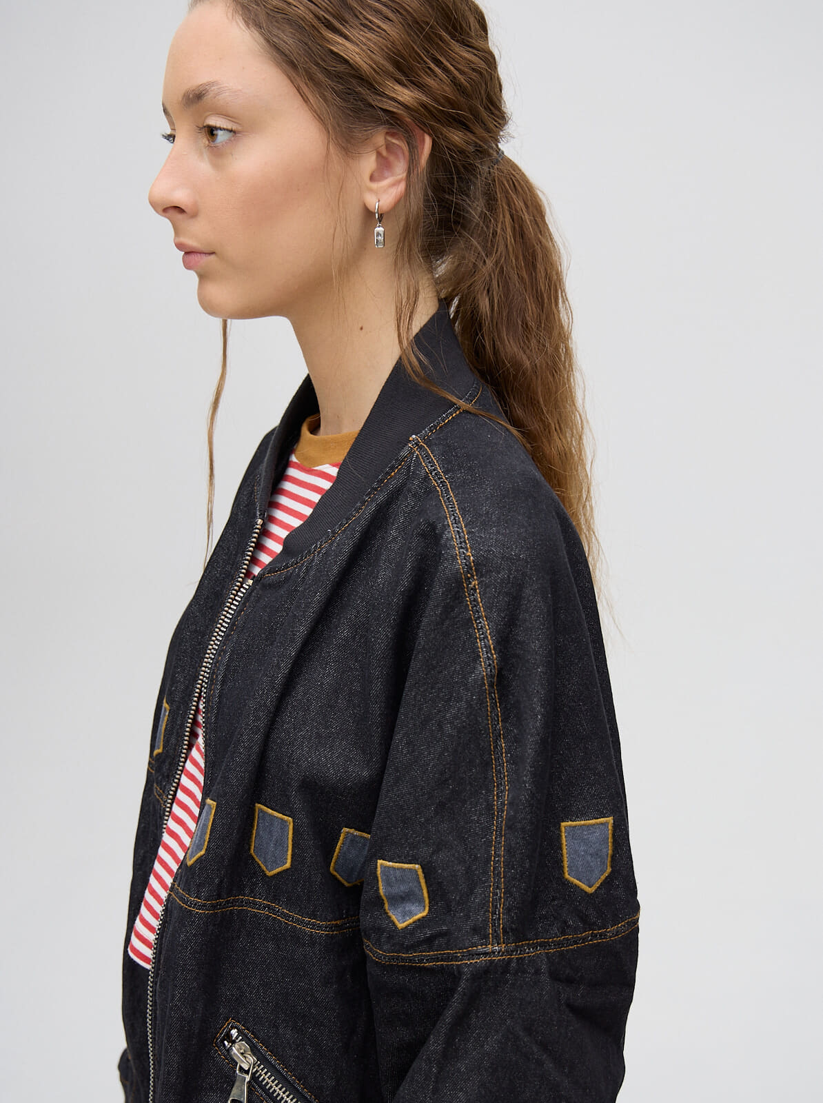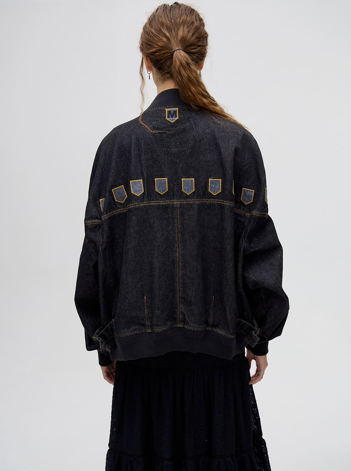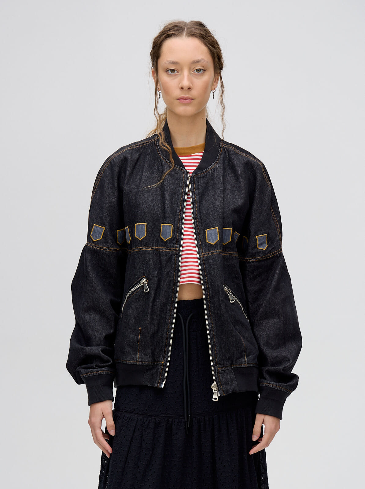 campera bomber MUTMA celica, confeccionada en denim algodón con cierres metálicos y detalles de diseño en la parte delantera.