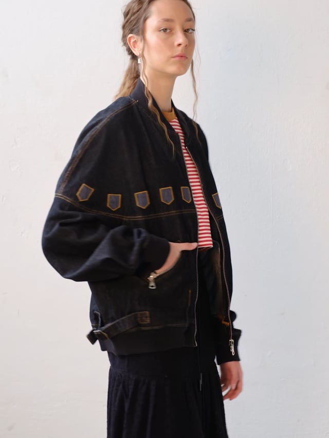 campera bomber MUTMA celica, confeccionada en denim algodón con cierres metálicos y detalles de diseño en la parte delantera.