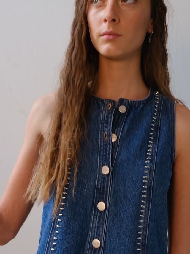 MUTMA patri está confeccionado en un denim liviano, con detalle de apliques metalizados a lo largo y cartera de botones a juego. puño del bajo terminado en flecos. multi-set disponible con falda, pantalón o short. los gustos, los colores, ya saben cómo es.