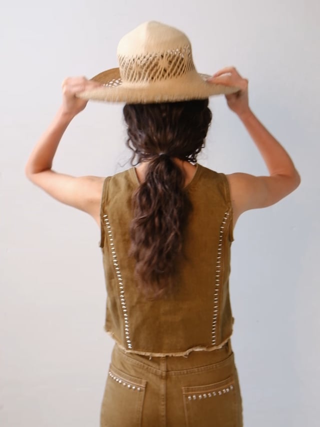 MUTMA patri está confeccionado en un denim liviano, con detalle de apliques metalizados a lo largo y cartera de botones a juego. puño del bajo terminado en flecos. multi-set disponible con falda, pantalón o short. los gustos, los colores, ya saben cómo es.