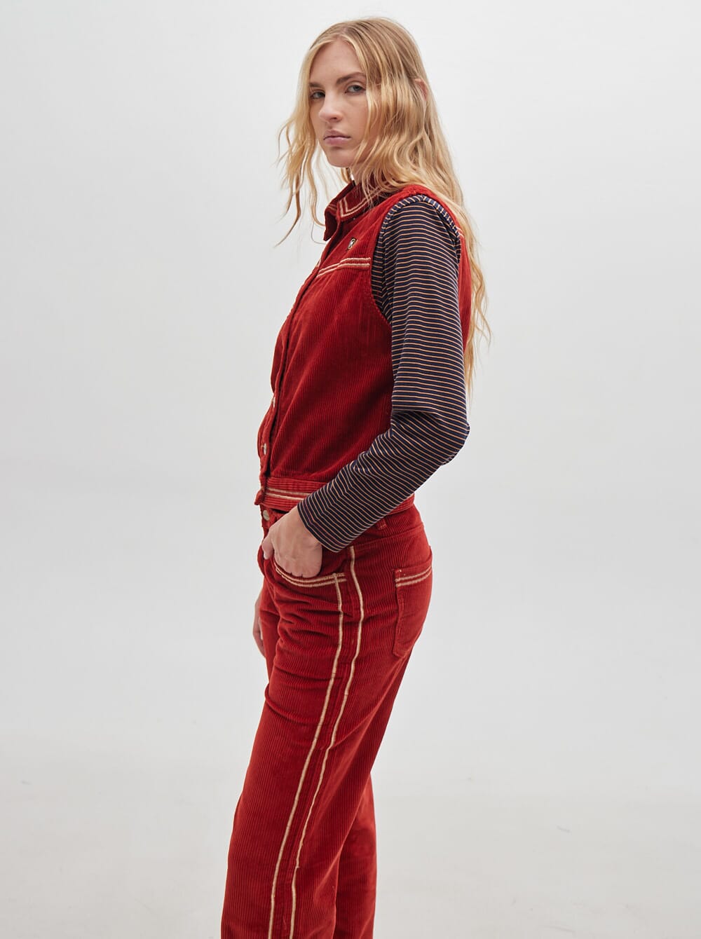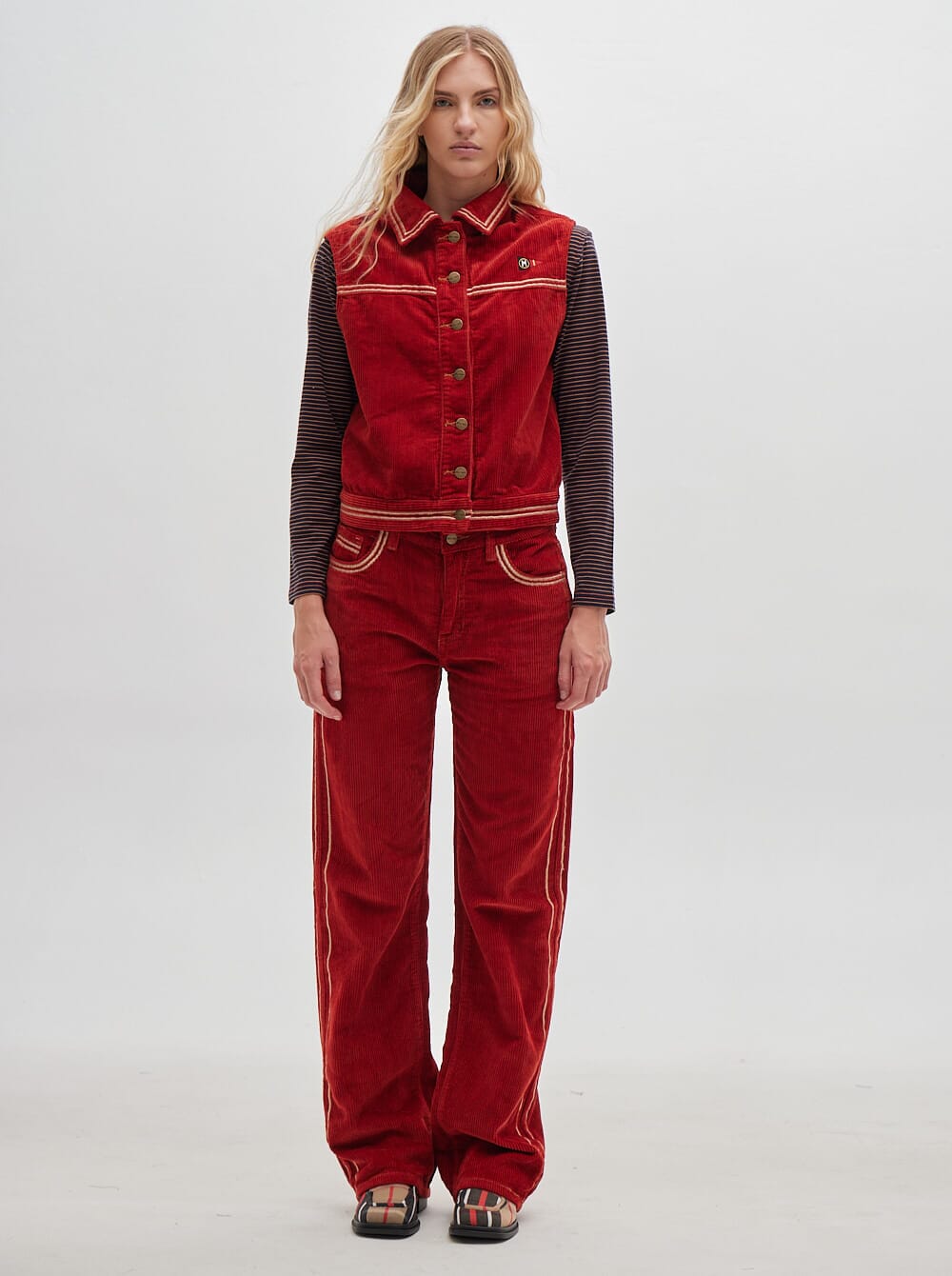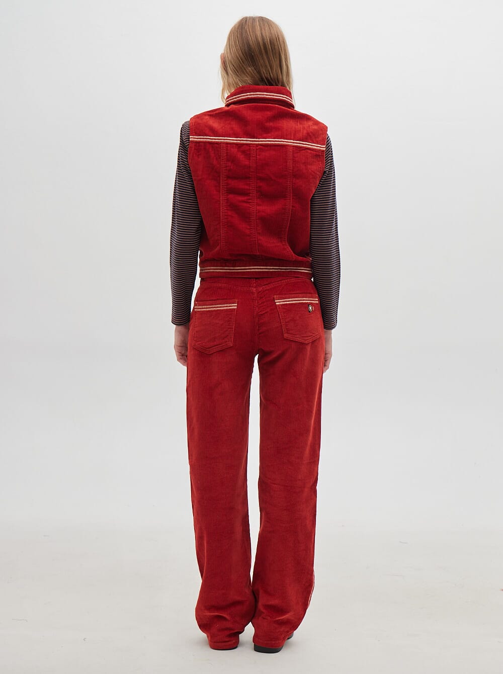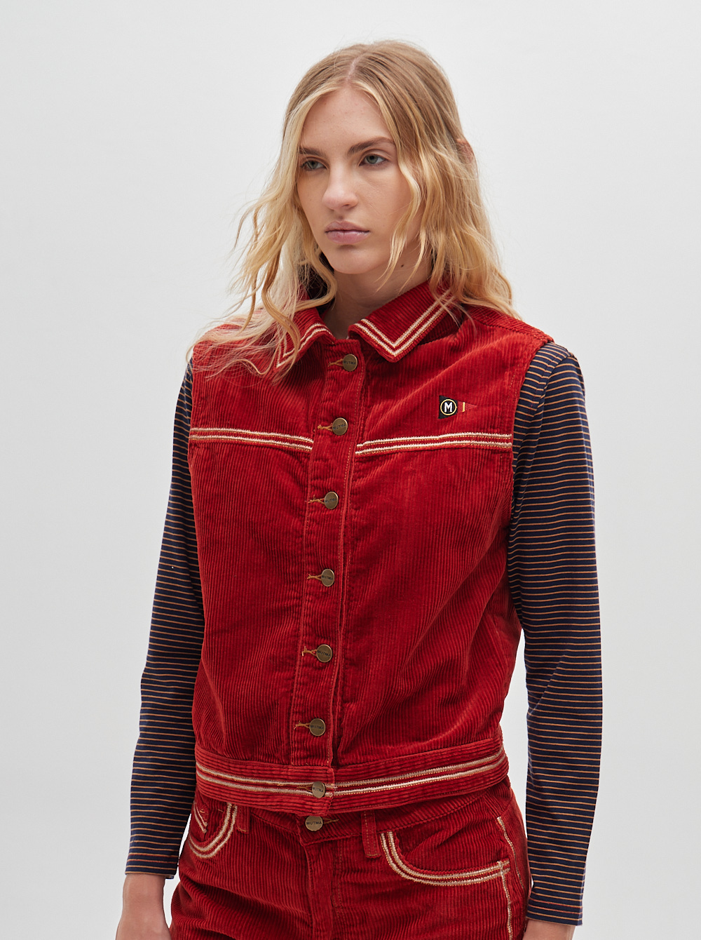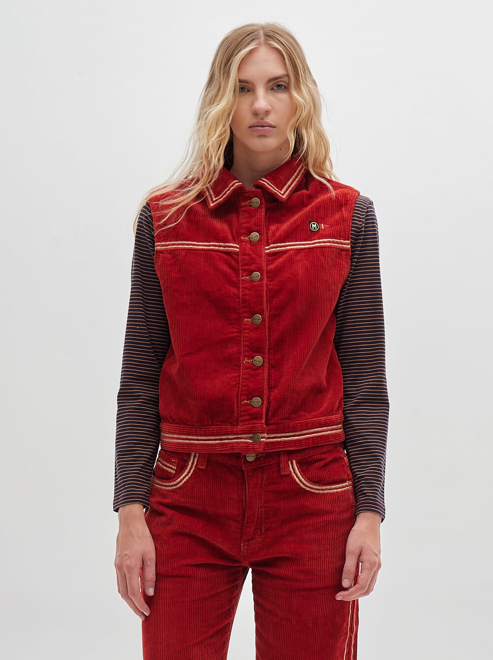 el chaleco MUTMA roy es ideal para combinar con cualquier polera y encarar el invierno de a poco. detalle de diseño en cartera, cuello y canesú, a juego con el pantalón MUTMA cordo. bandera insignia de la colección gales en la parte delantera.