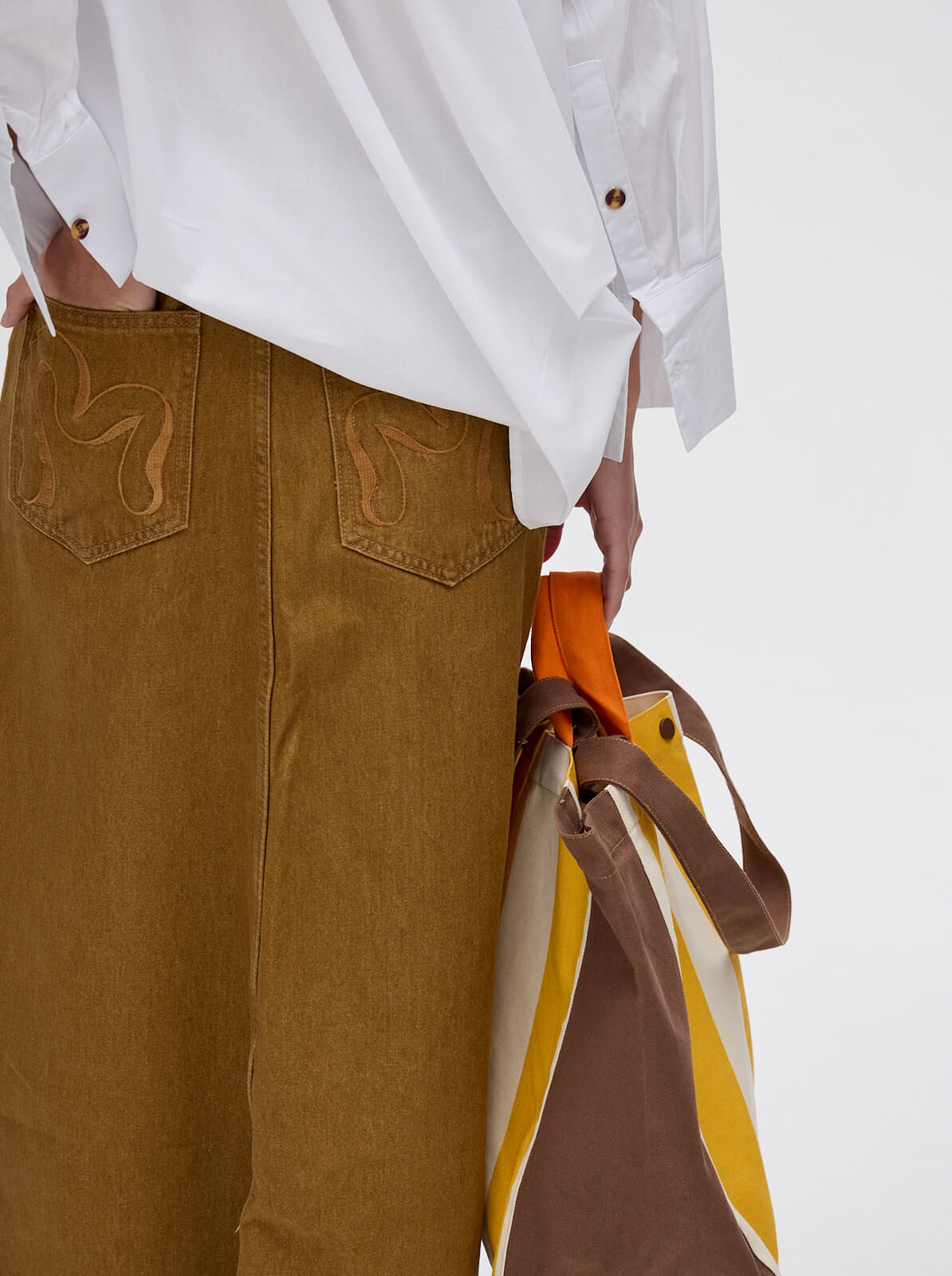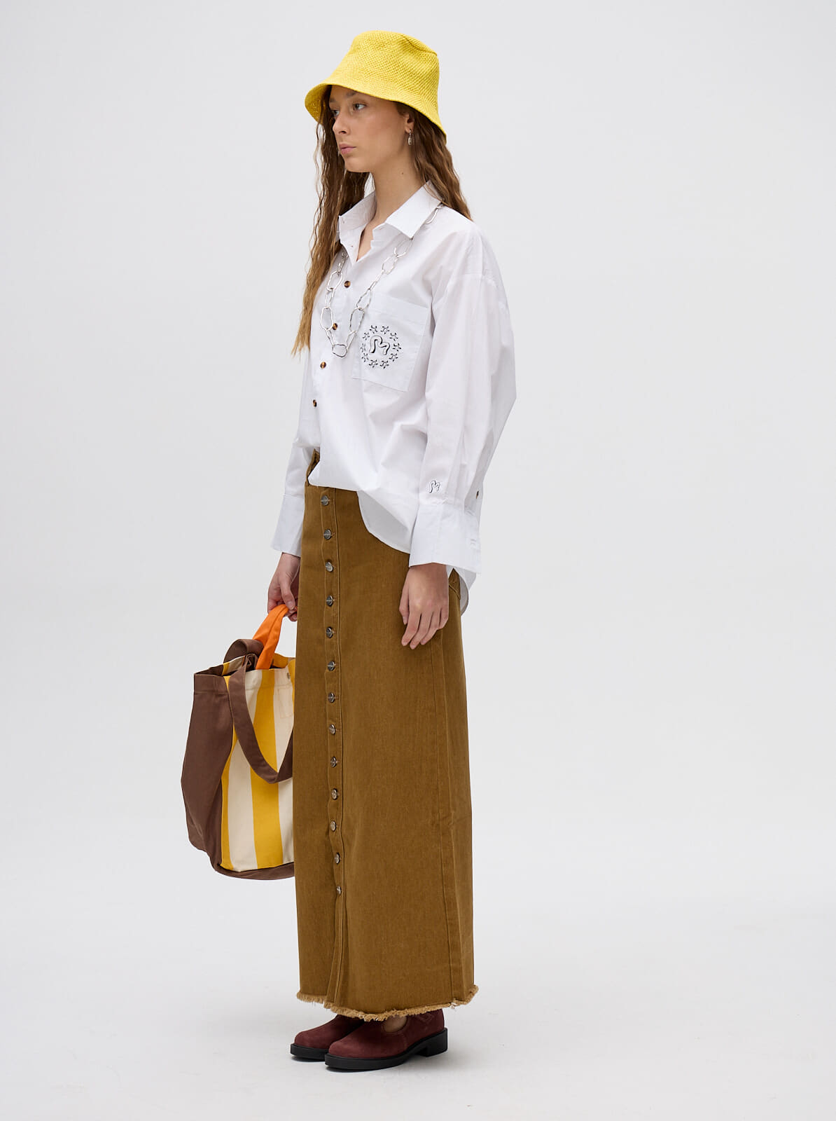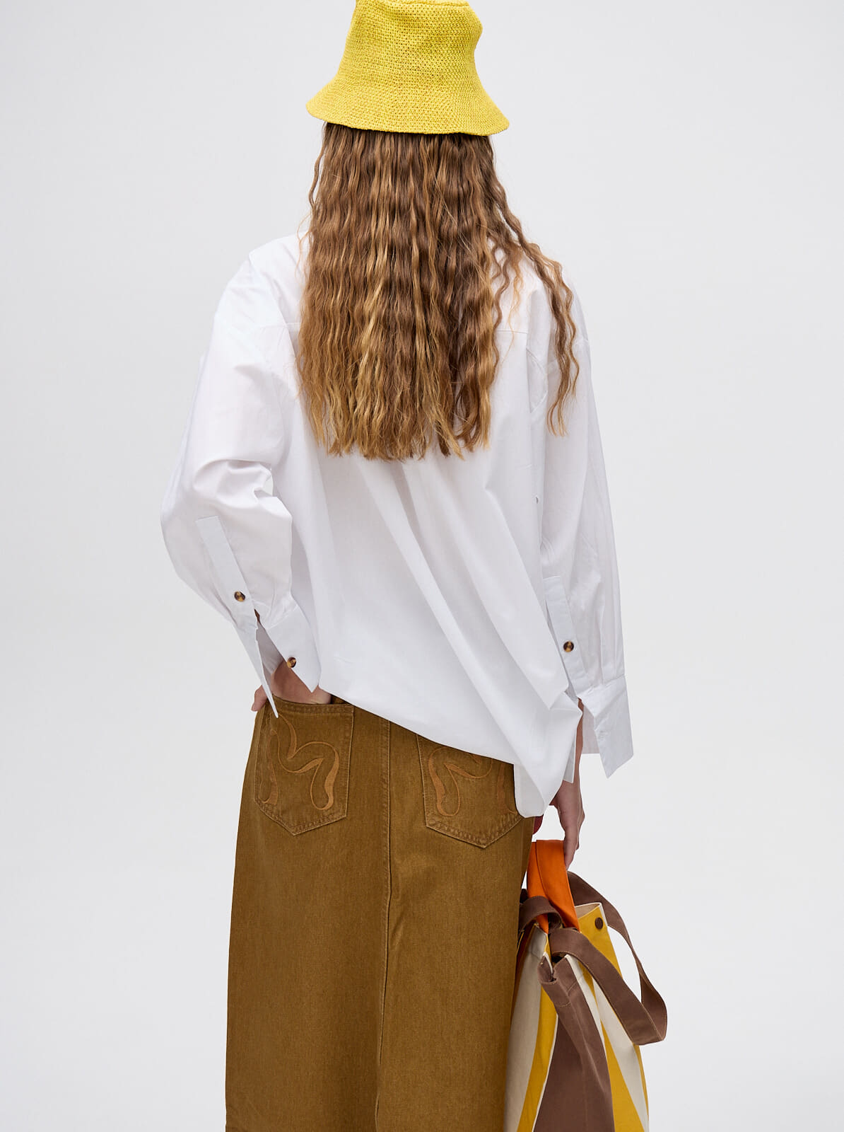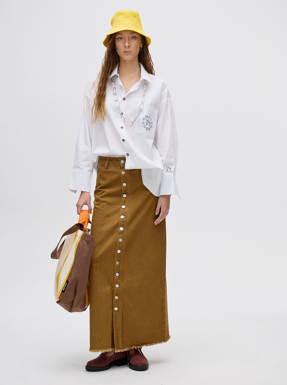 pollera denim de tiro medio, fit recto y terminada con un tajo adelante. largo midi, disponible del talle xs al xl.