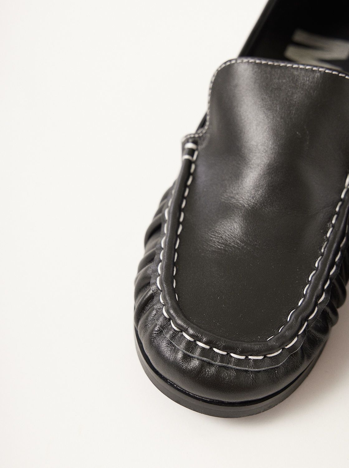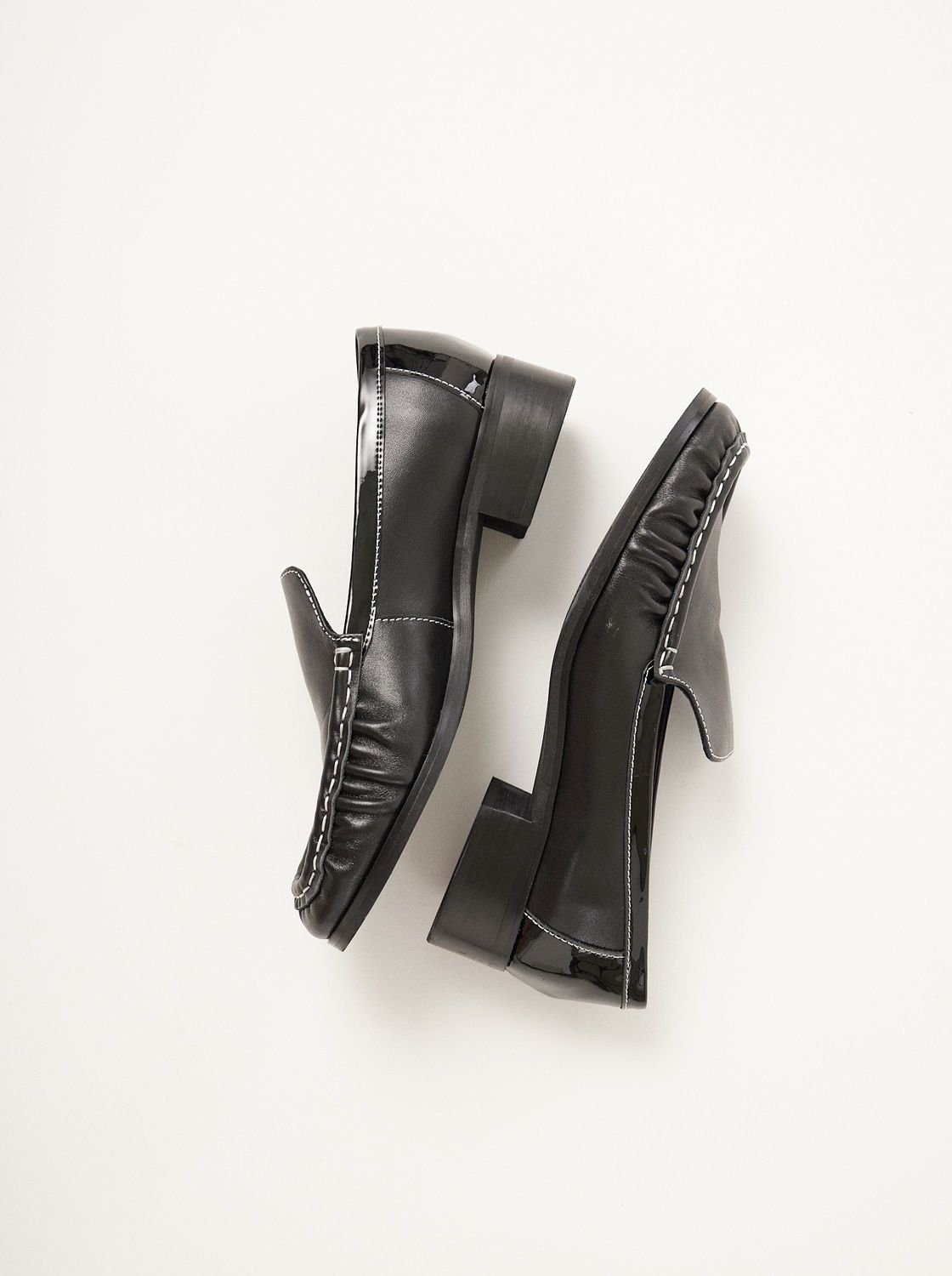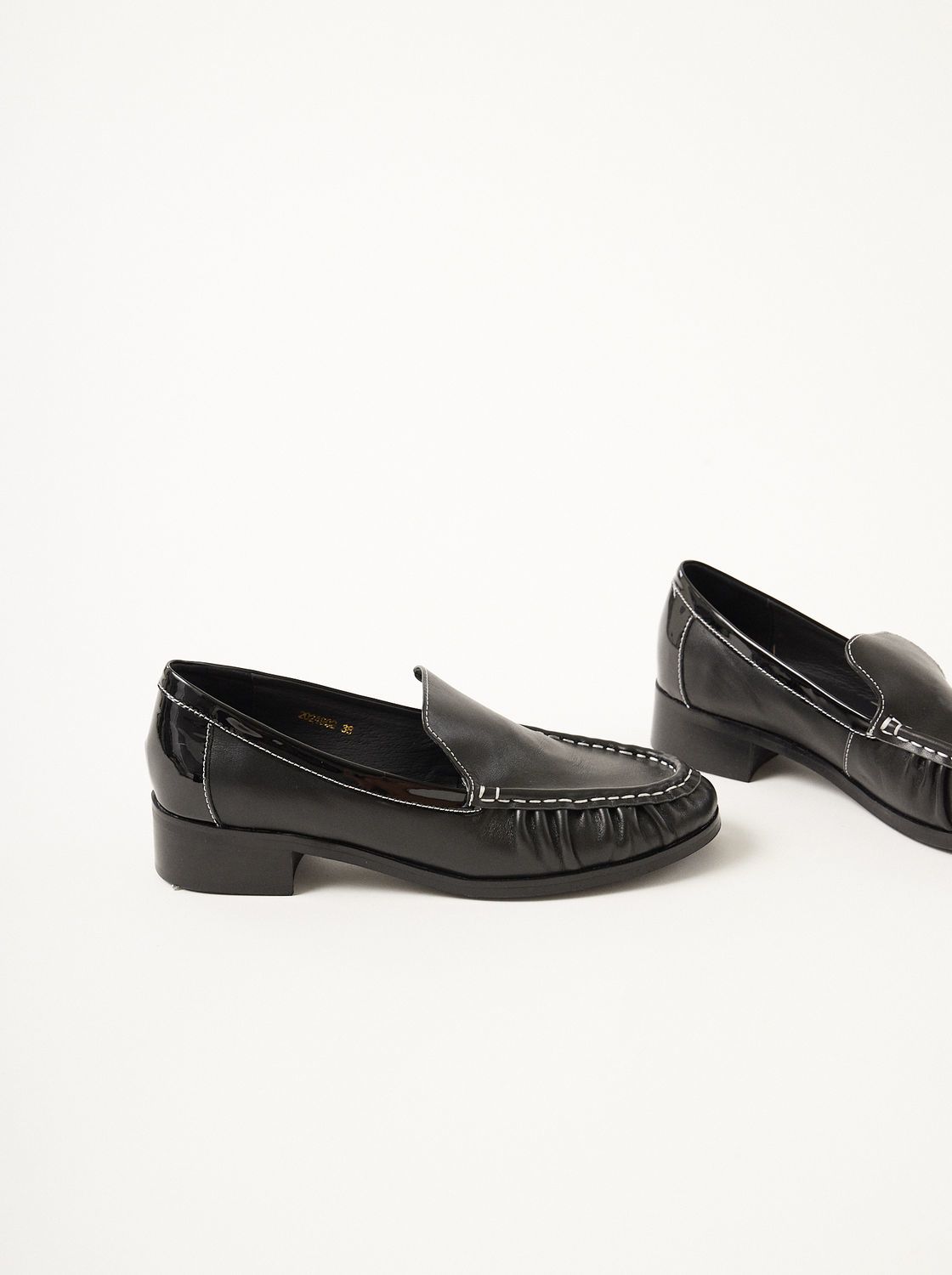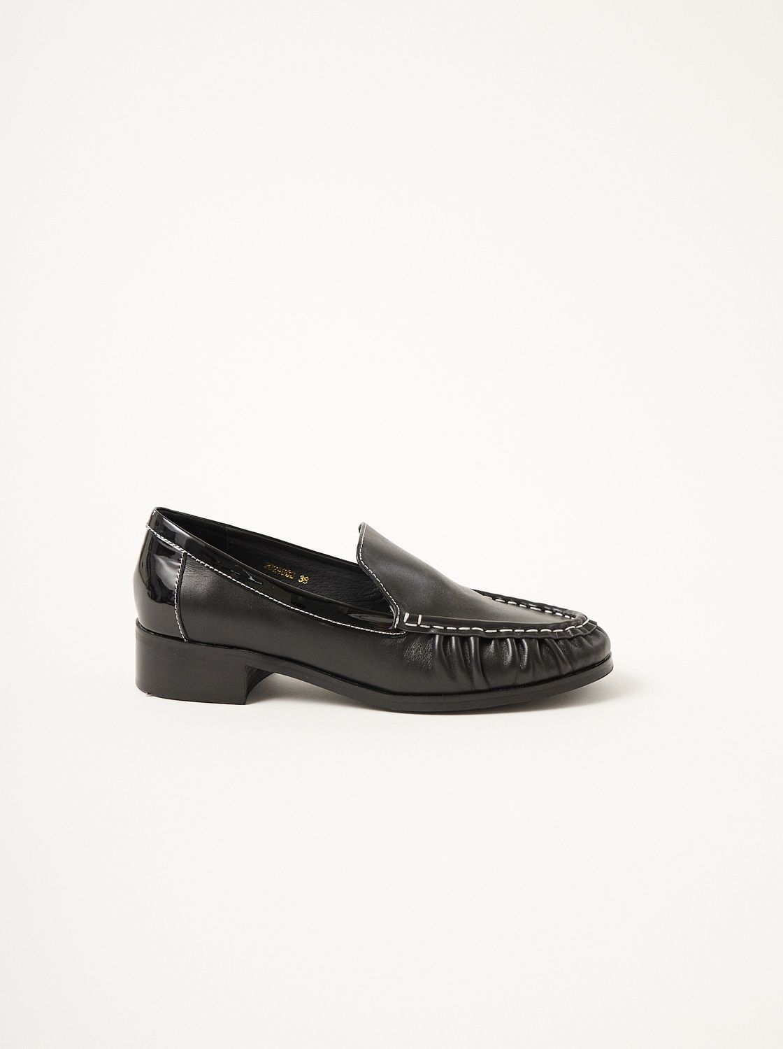 MUTMA finco, nuestra versión #iggy del mocasín clásico está hecho en cuero y apliques de charol muy minimal. tiene un pespunte en hilo de distinto color todo a lo largo.