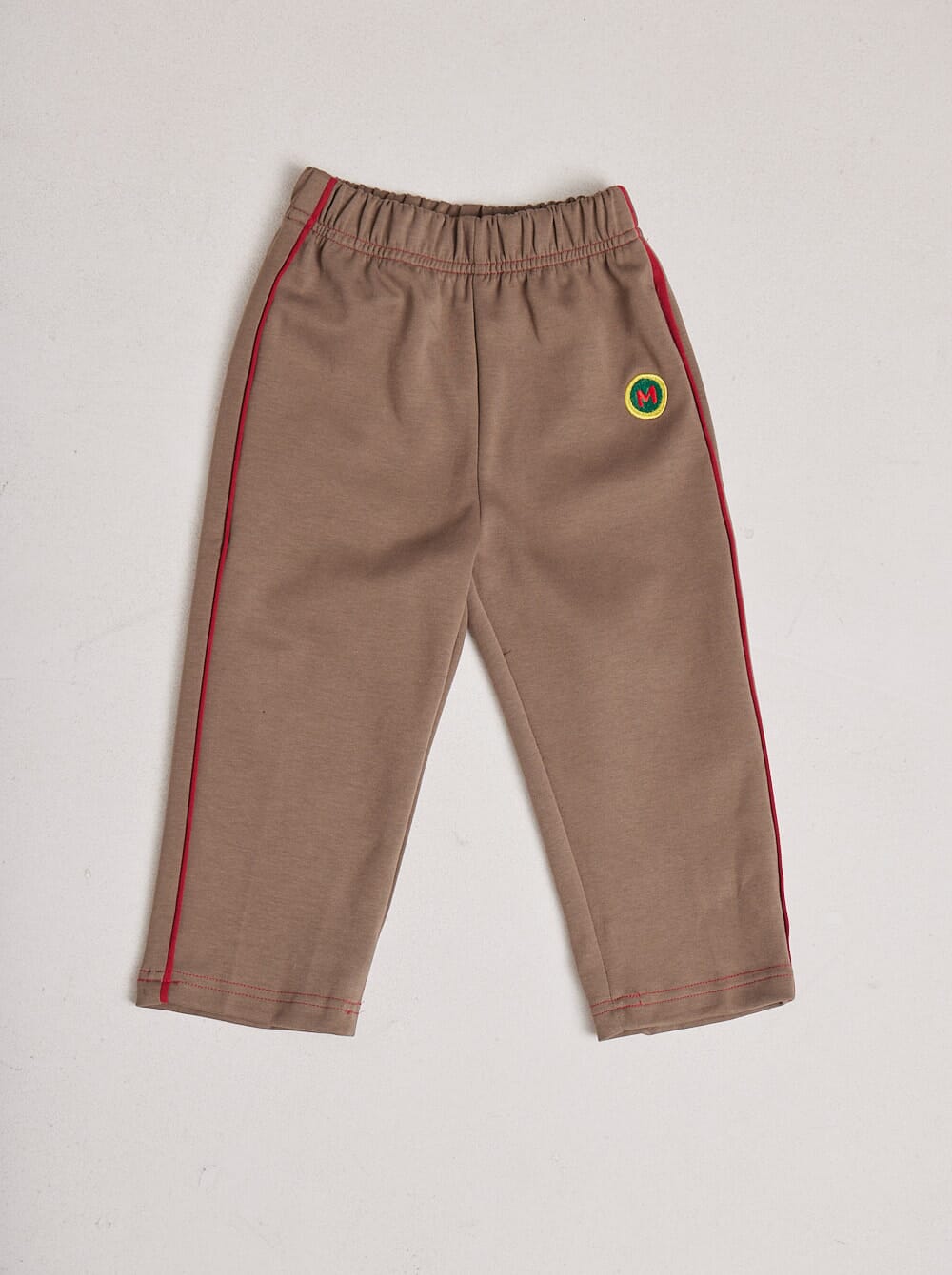 pantalón tipo jogging confeccionado en algodón grueso, cómodo y abrigado. diseño sobrio con detalle de línea al costado y puños de colores, a juego con su set. en parte delantera, logo bordado en tipografía retro, la insignia de los MUTMAkids.