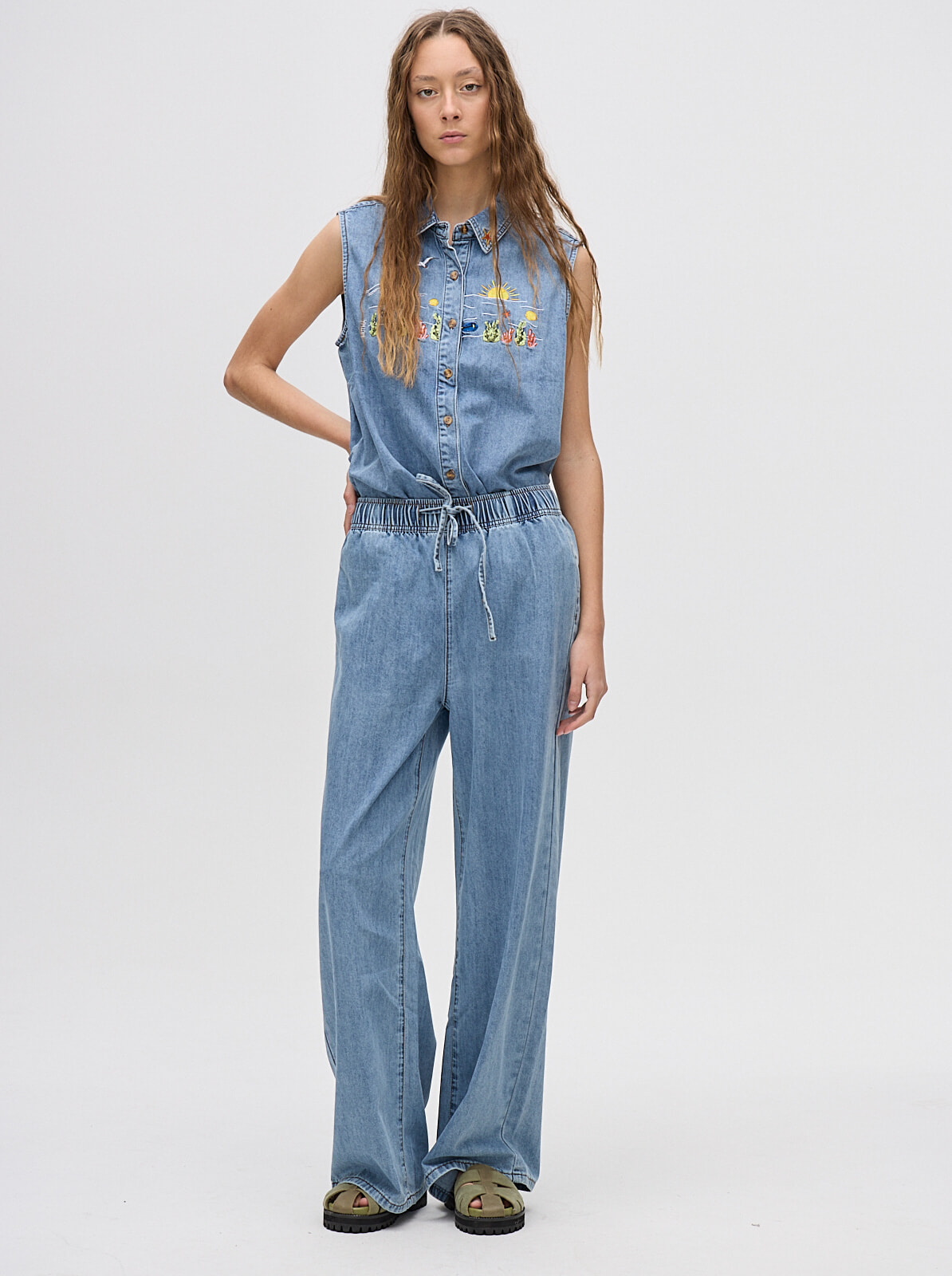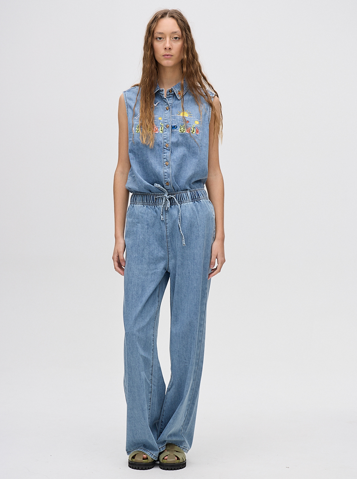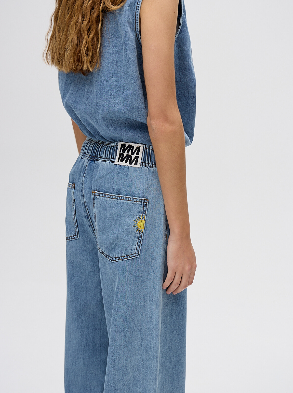 denim relajado, con tiras ajustables en pretina que lo hacen más sport. corte flojo y recto, ideal para combinar con nuestros tops al cuerpo MUTMA funguito.