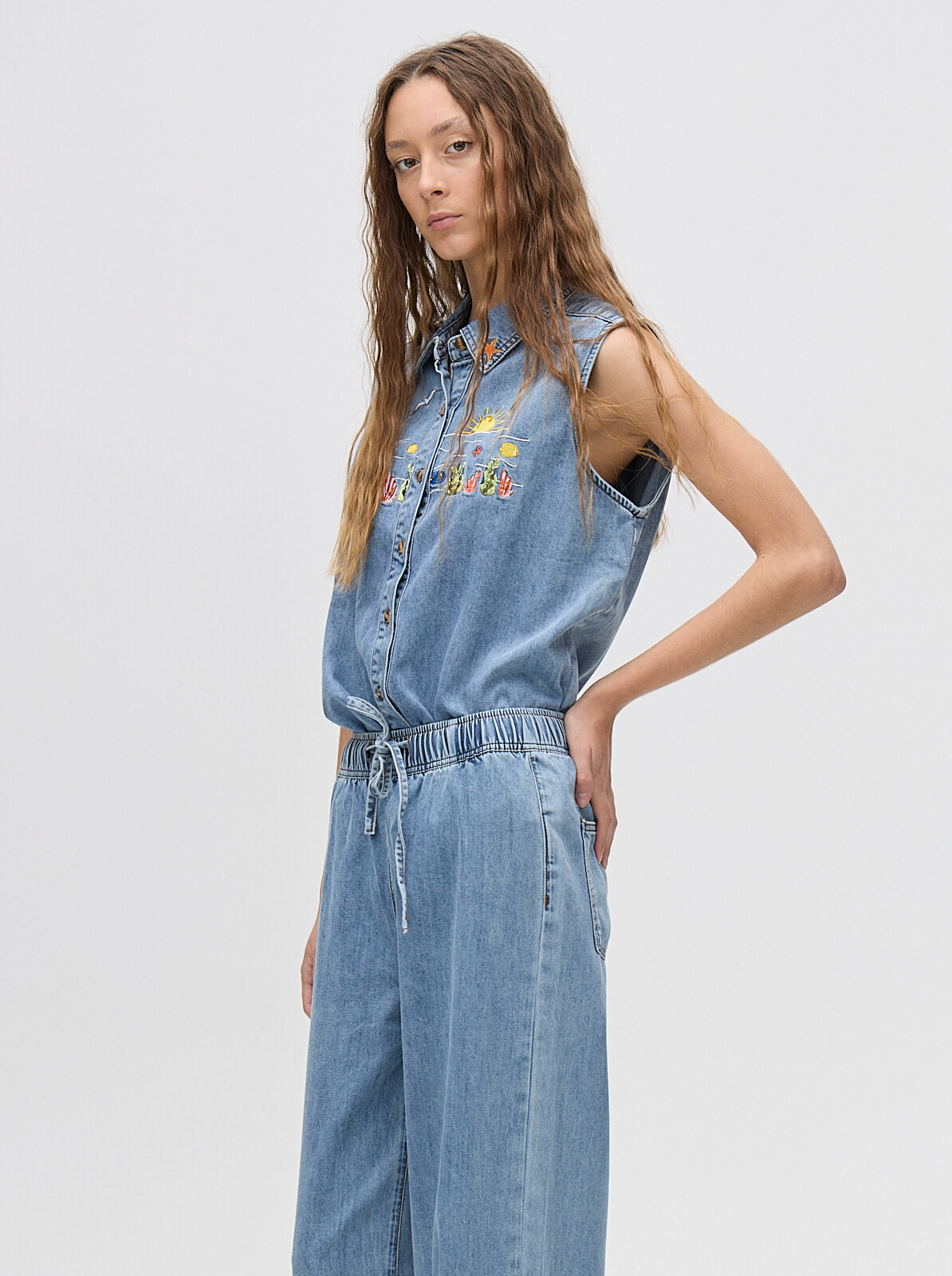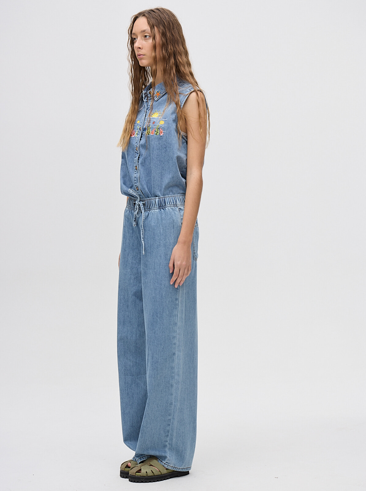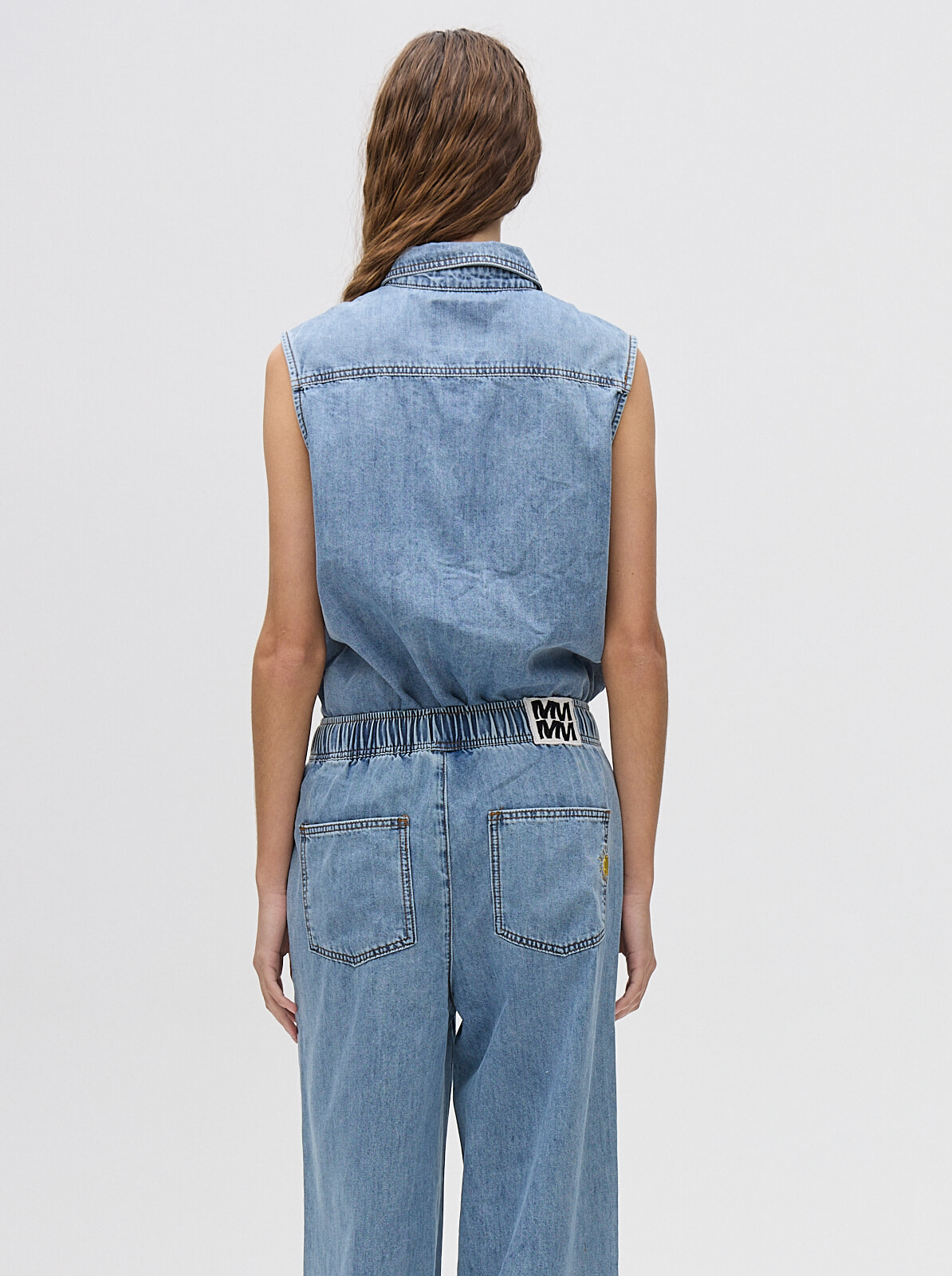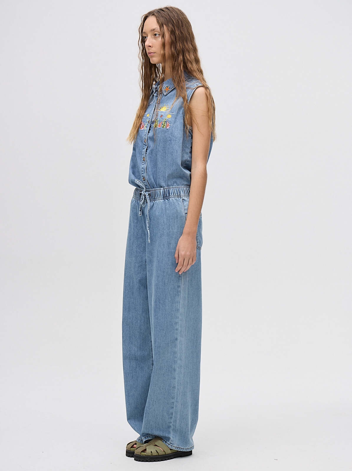 denim relajado, con tiras ajustables en pretina que lo hacen más sport. corte flojo y recto, ideal para combinar con nuestros tops al cuerpo MUTMA funguito.