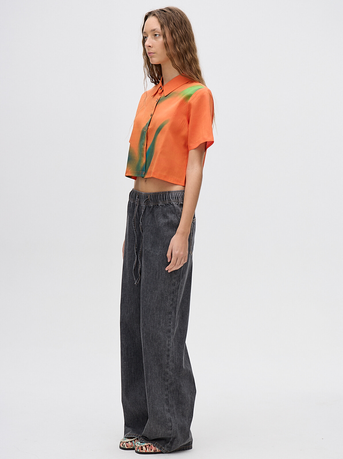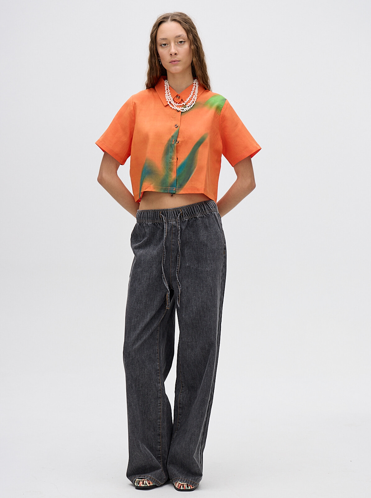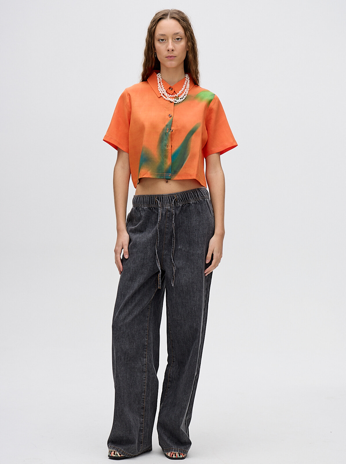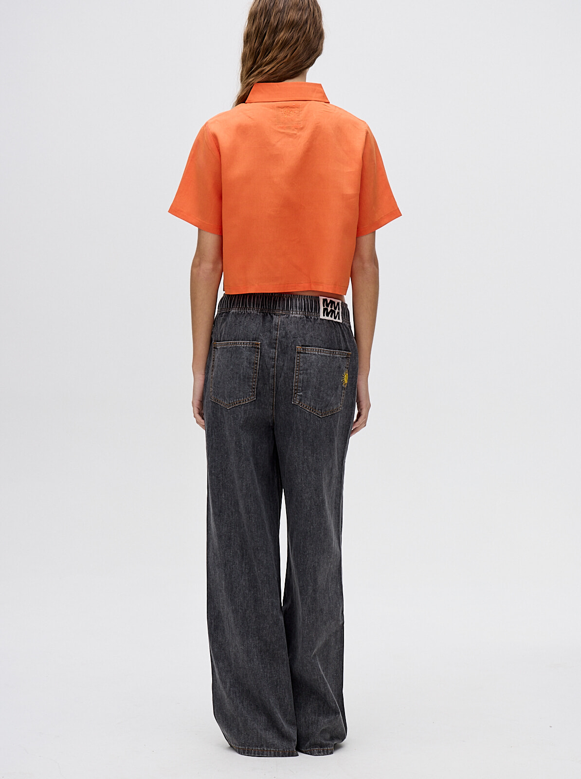 denim relajado, con tiras ajustables en pretina que lo hacen más sport. corte flojo y recto, ideal para combinar con nuestros tops al cuerpo MUTMA funguito.