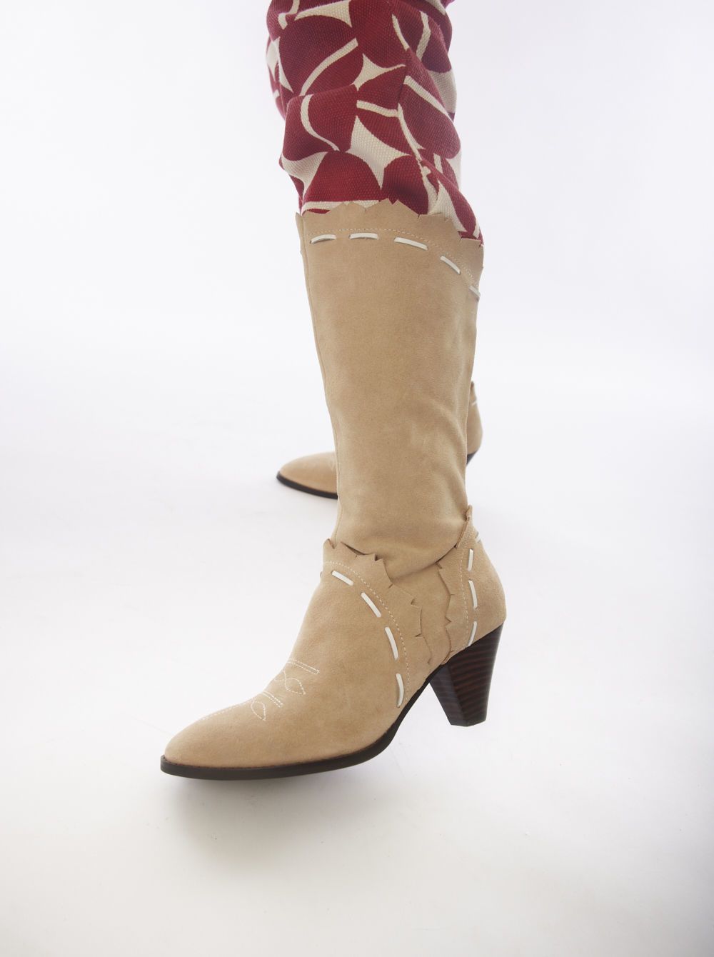 esta bota de gamuza de caña alta tiene pespuntes de cuero y detalle bordado en el empeine que la llevan a otra dimensión.