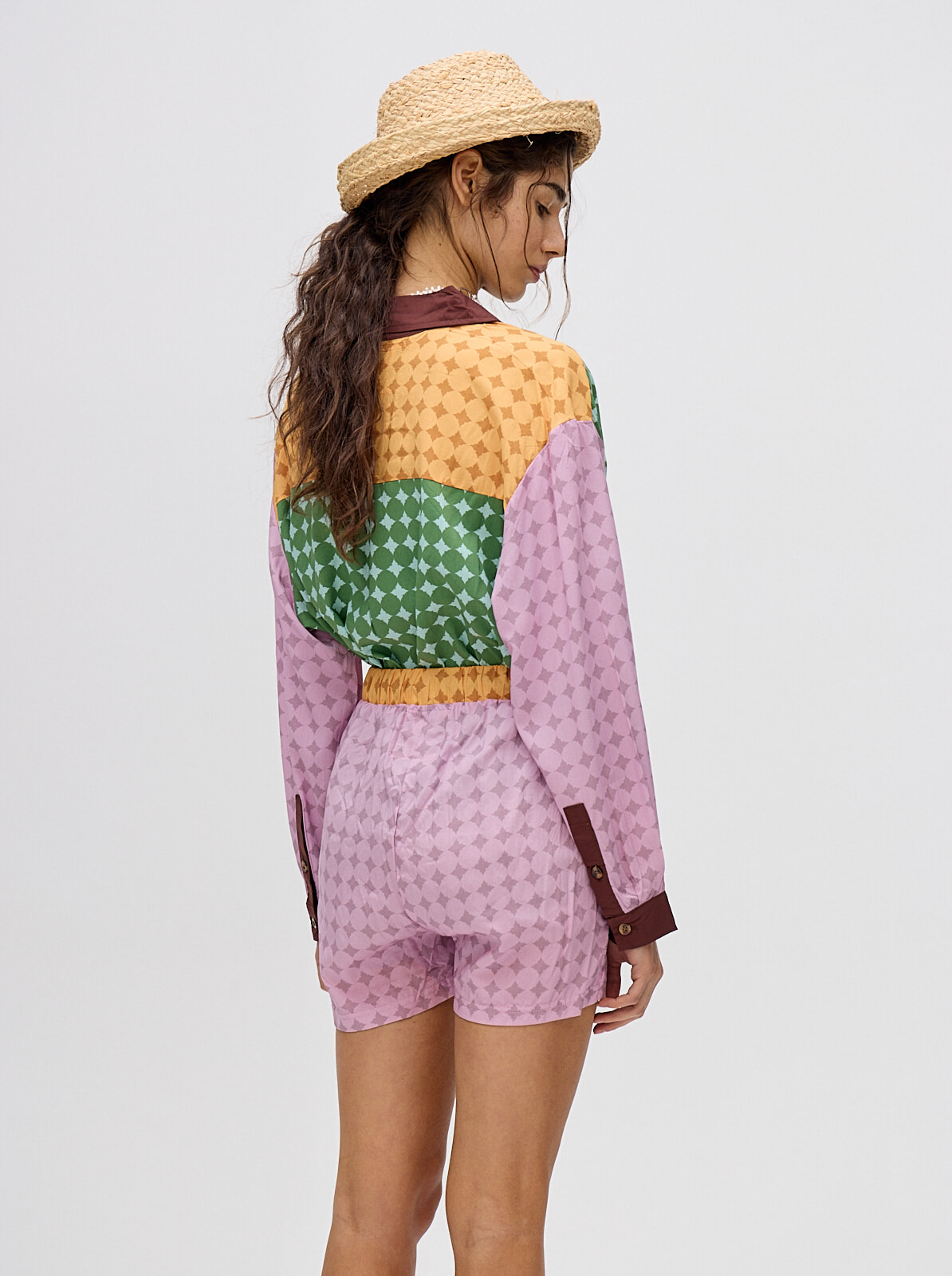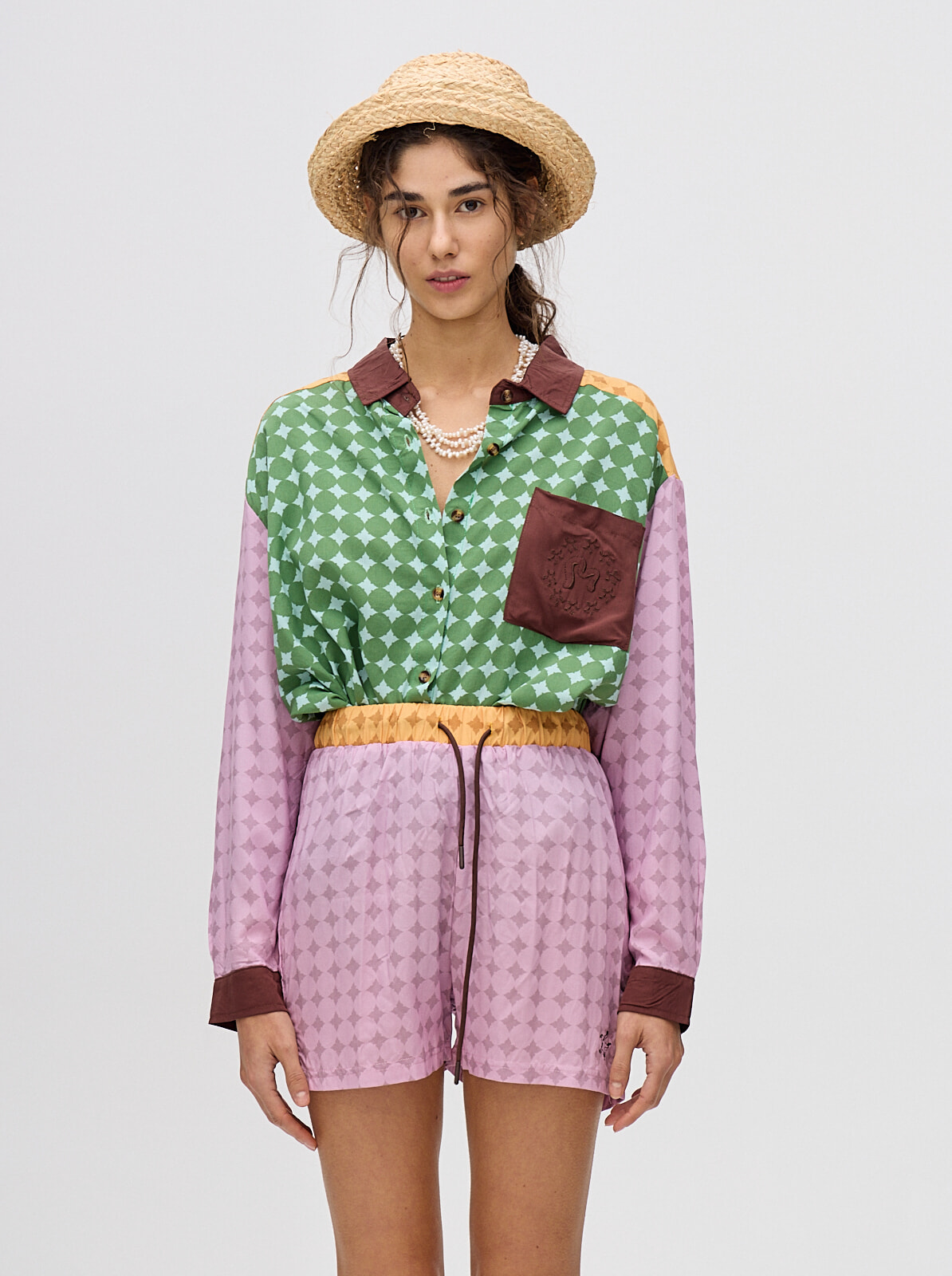 short boxy confeccionado en viscosa, pretina combinada para hacer juego con su set, camisa MUTMA cona.