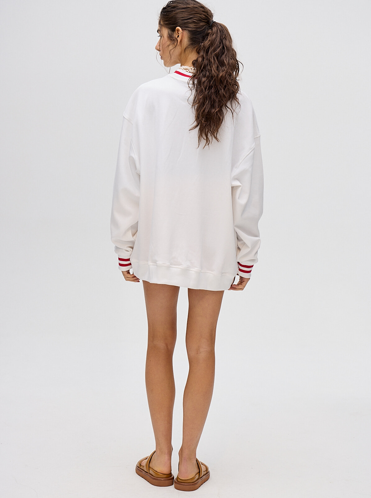 buzo básico con corte "crew", puños ajustados con diseño de rayas y estampa centrada.