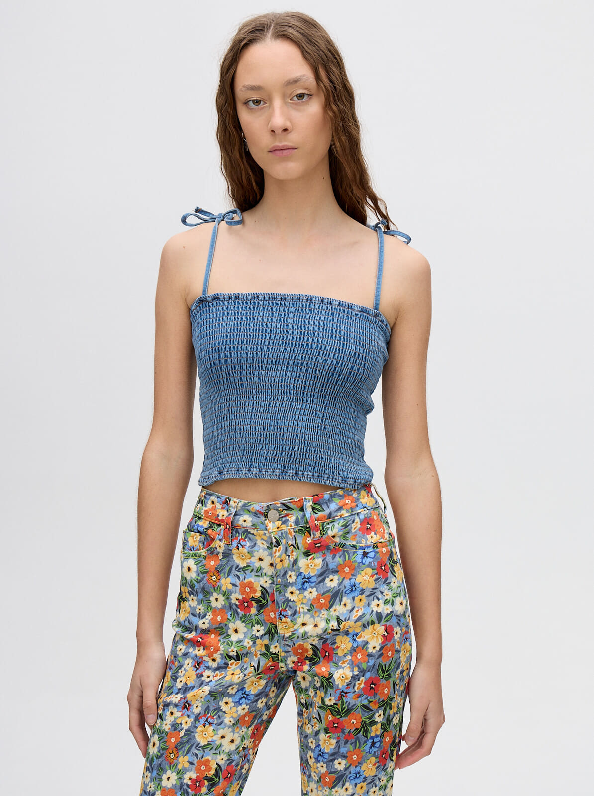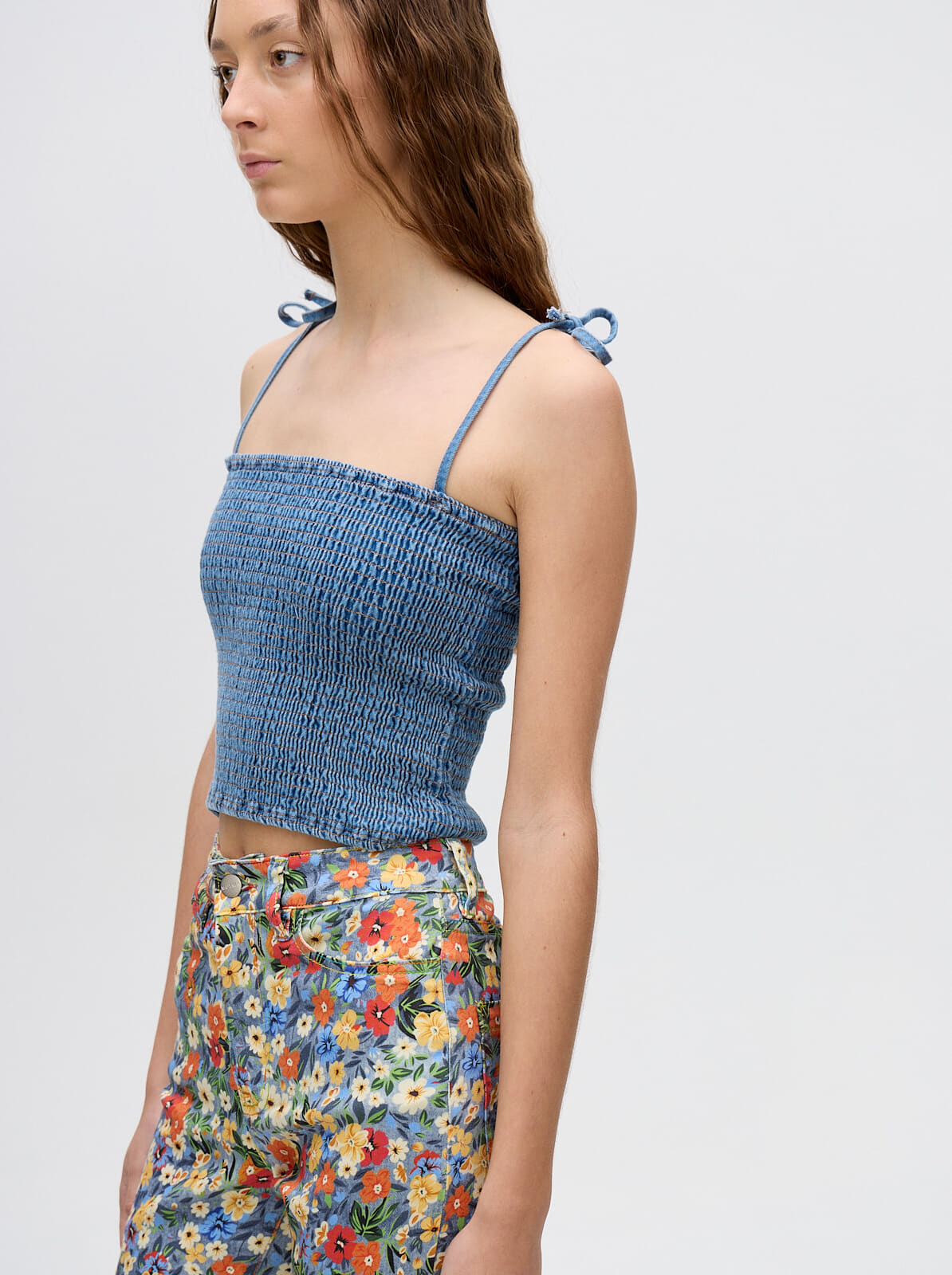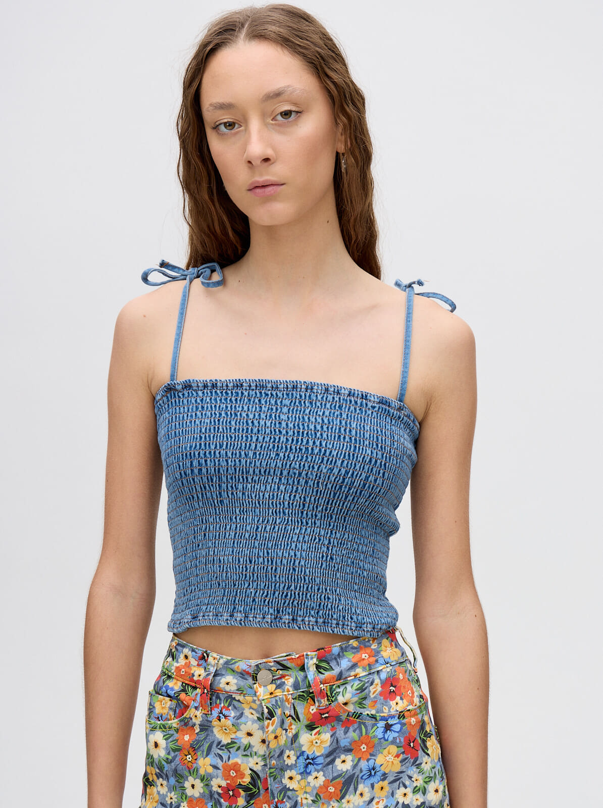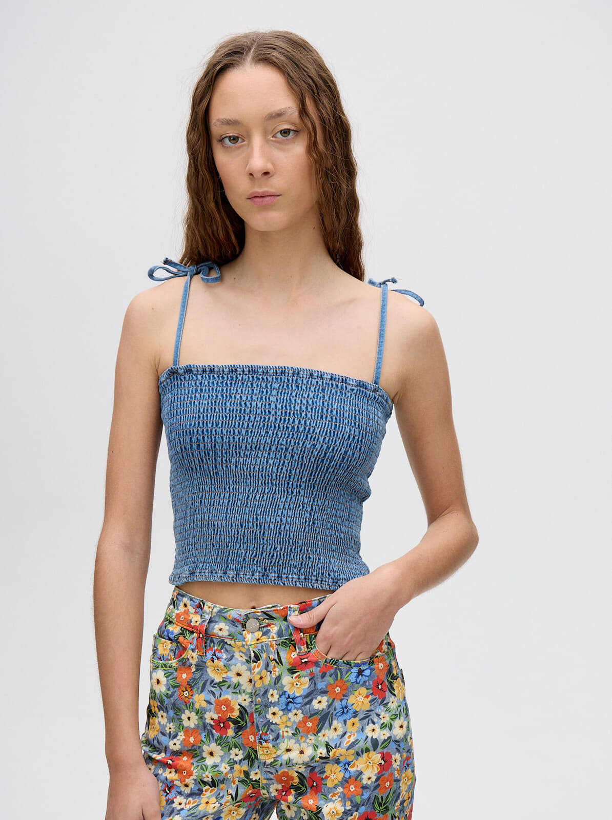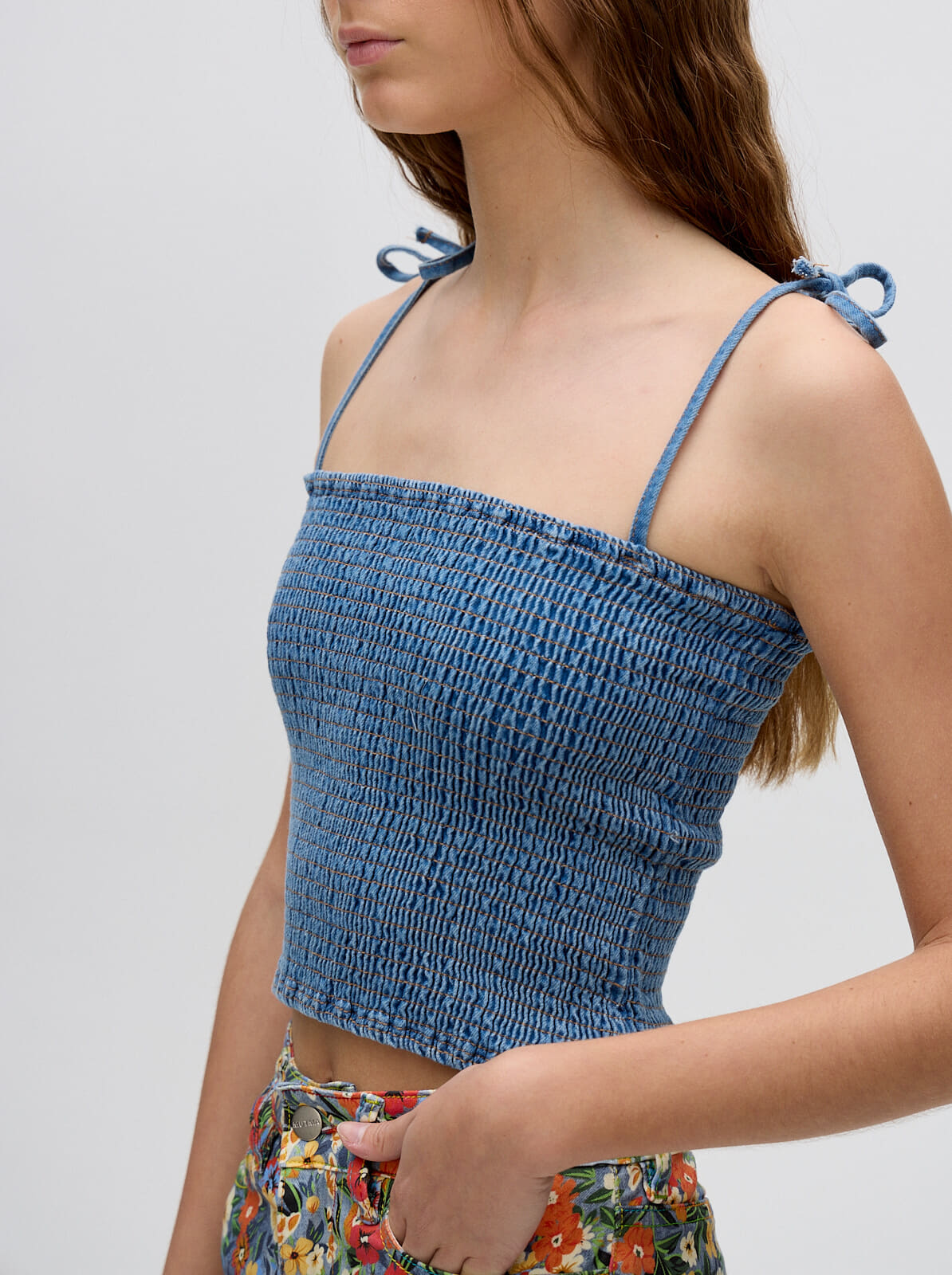 tela fruncida y fit al cuerpo, con lazos ajustables. corte crop, para combinar con nuestro denim MUTMA suso o falda clinca.