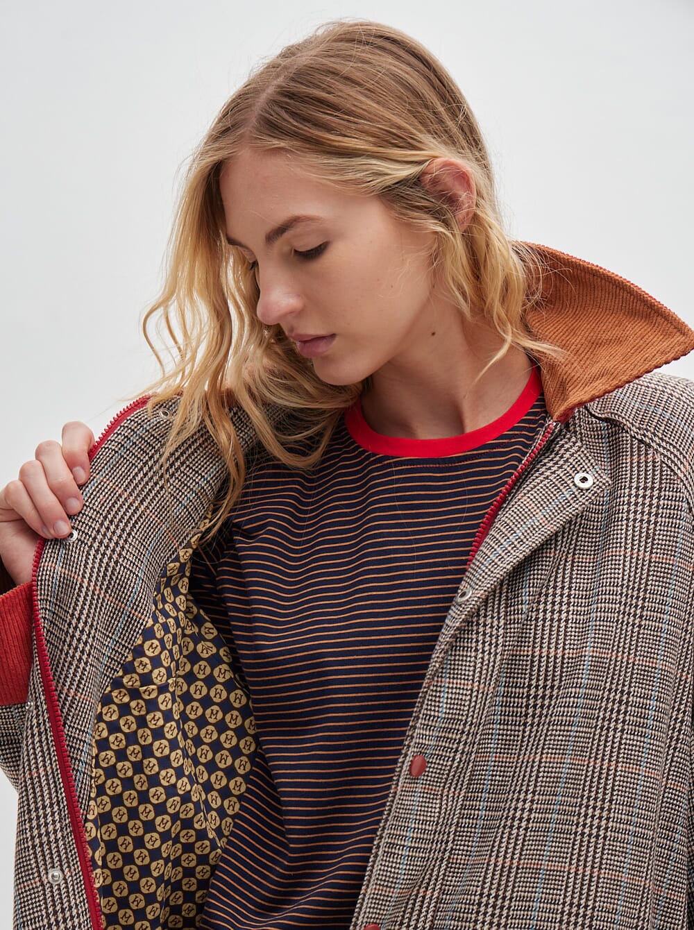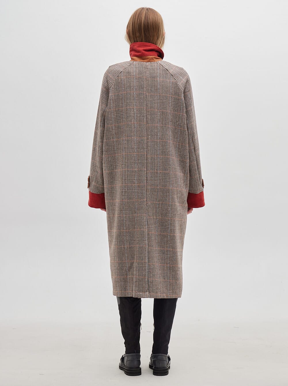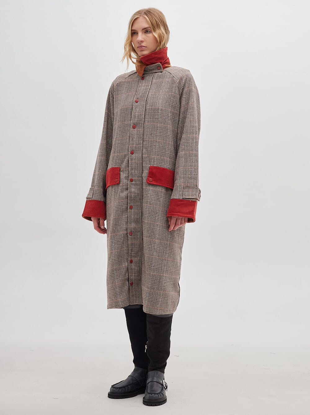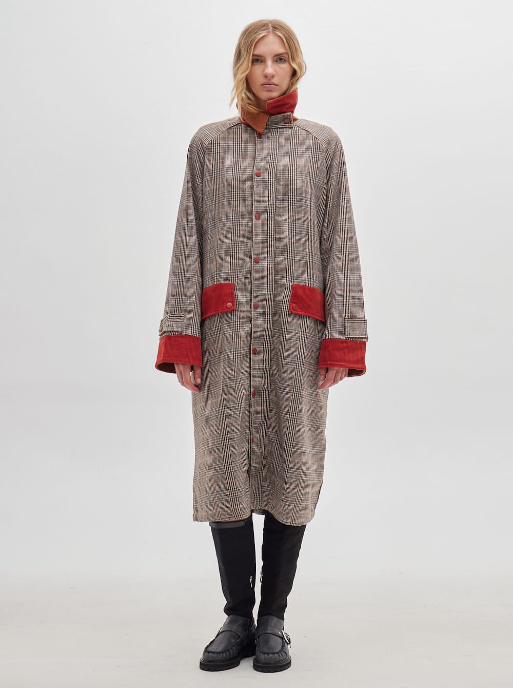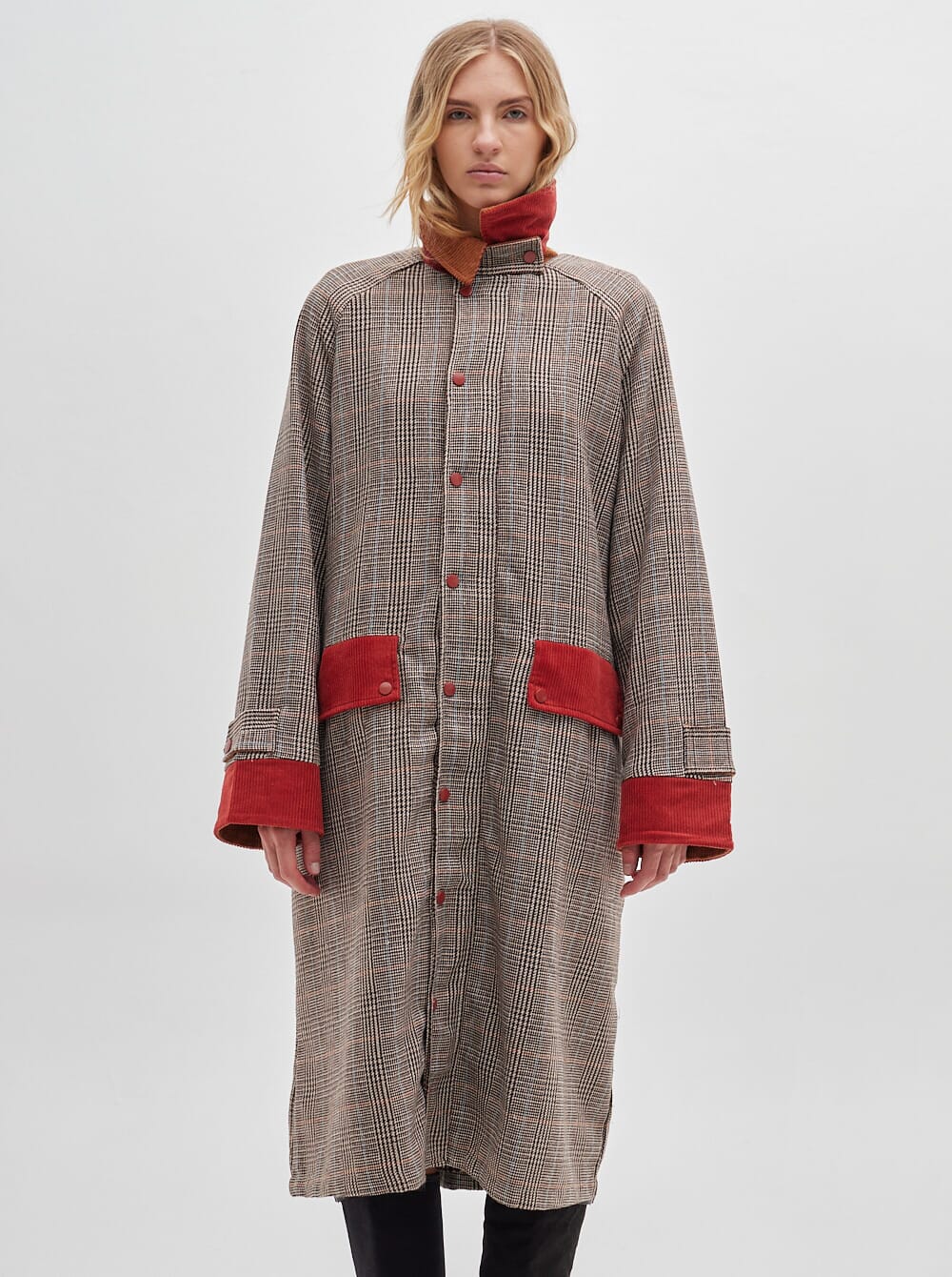 gabardina hasta el piso y estampa en cuadrillé, confeccionada en lana con bolsillos, puños y cuello en pana. puños de manga reversibles en pana de distinto color.