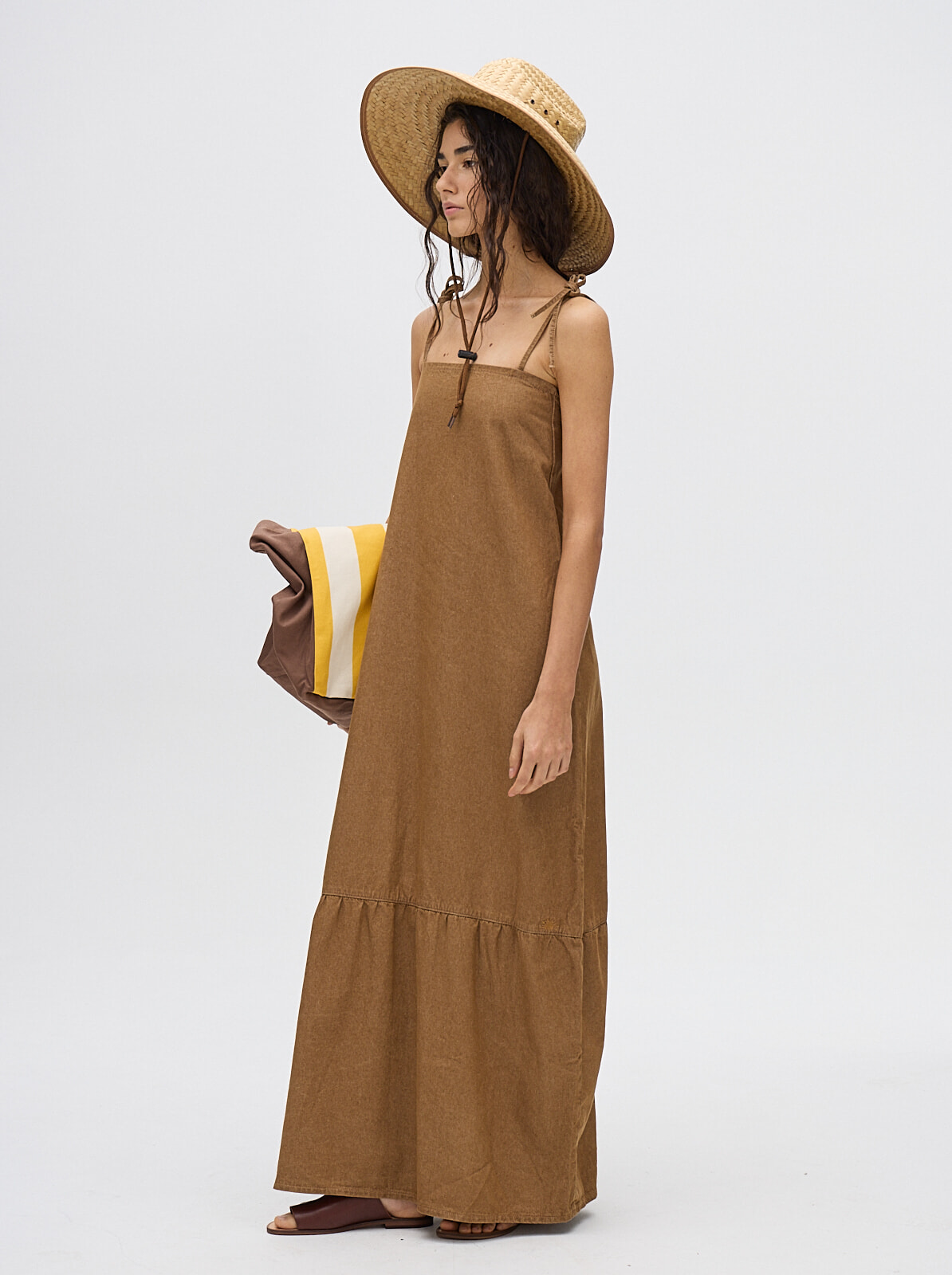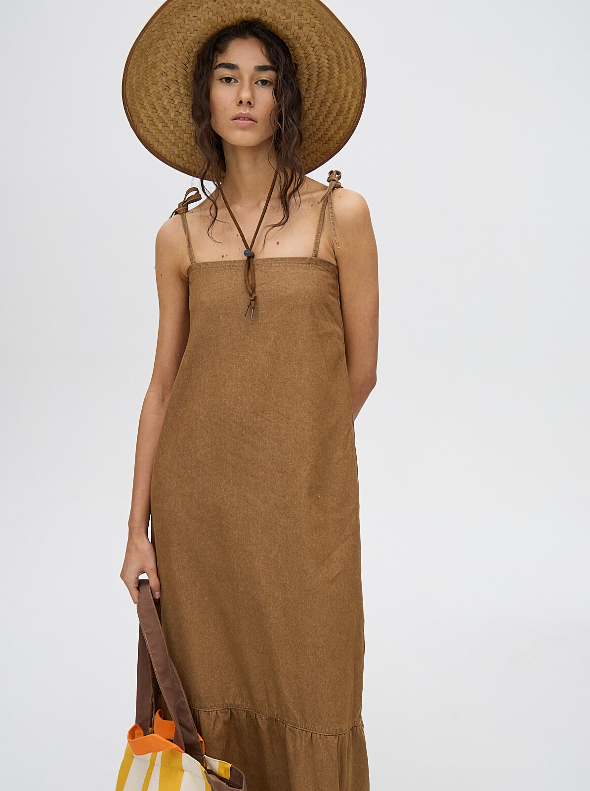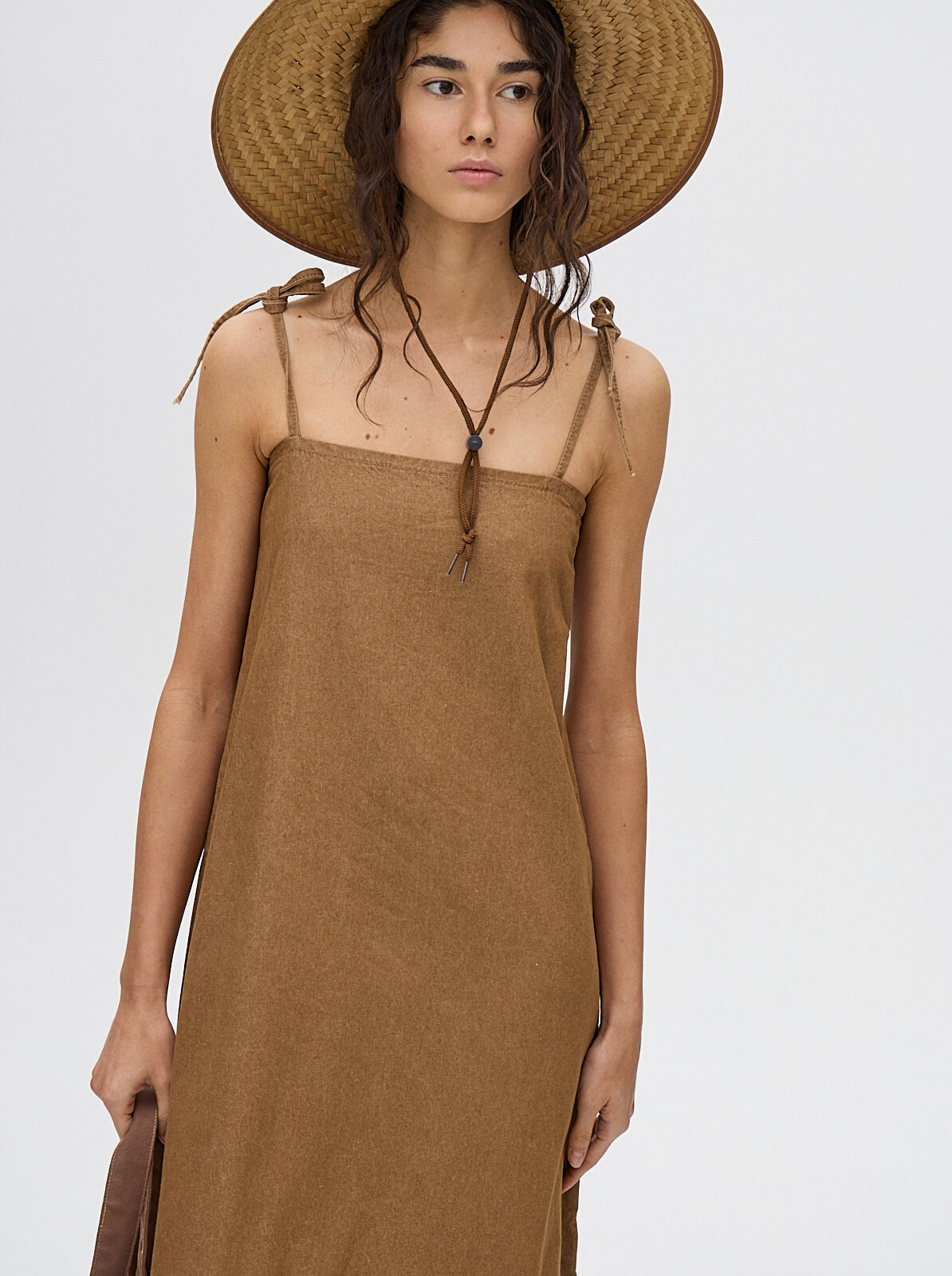corte midi y lazos ajustables, cae suelto. terminado con semi-pollera en el bajo, detalle de lazos a juego.