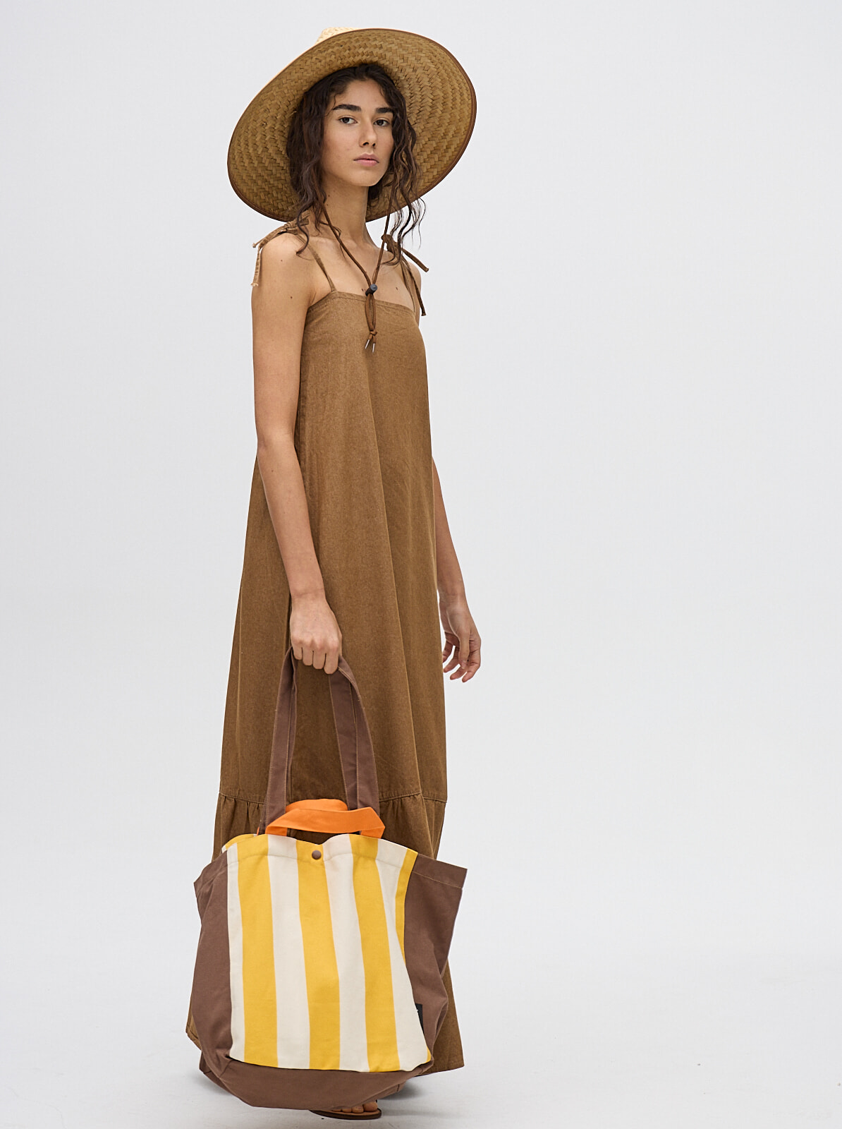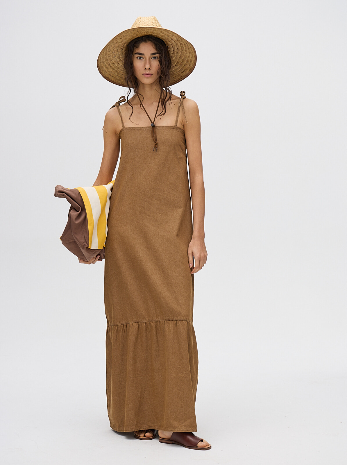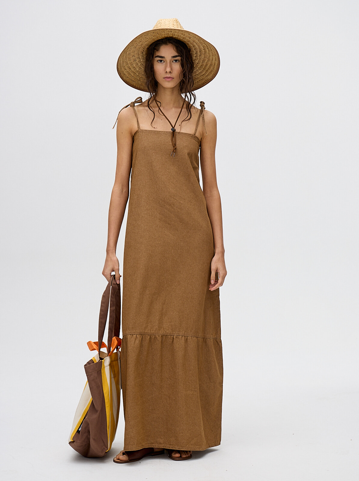 corte midi y lazos ajustables, cae suelto. terminado con semi-pollera en el bajo, detalle de lazos a juego.