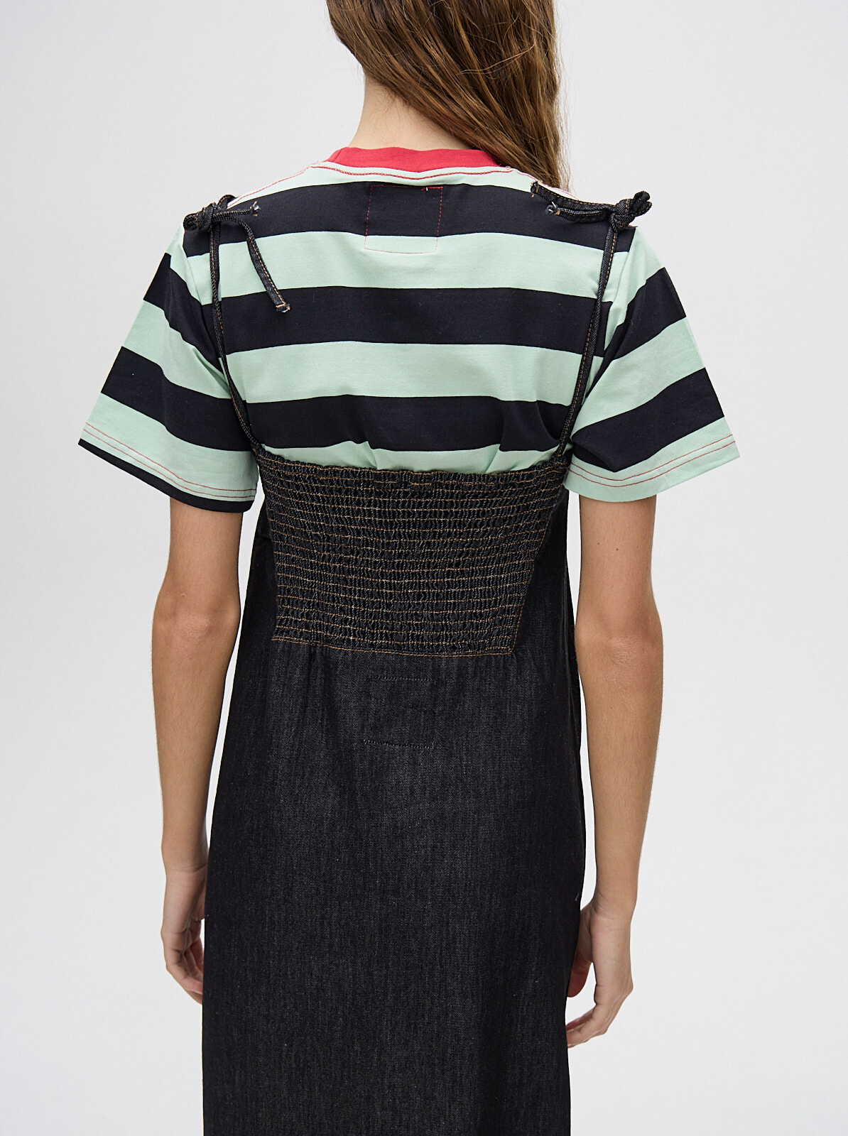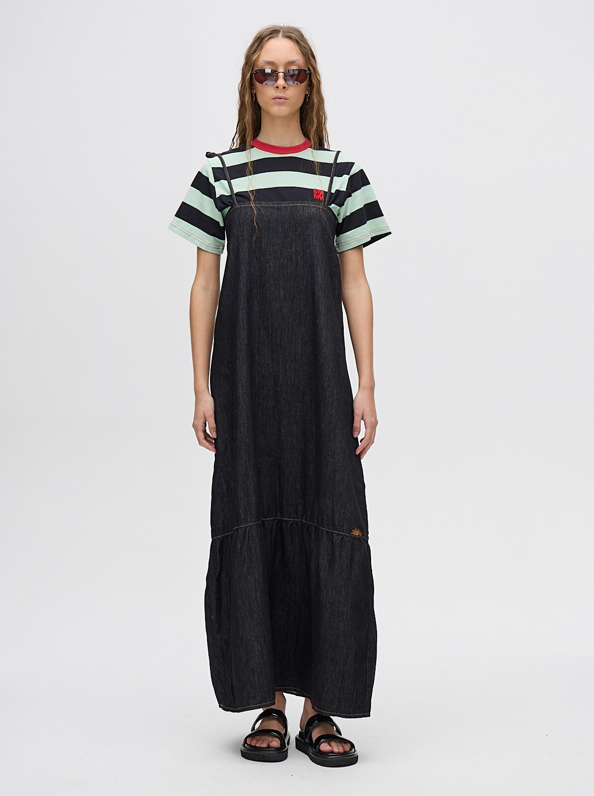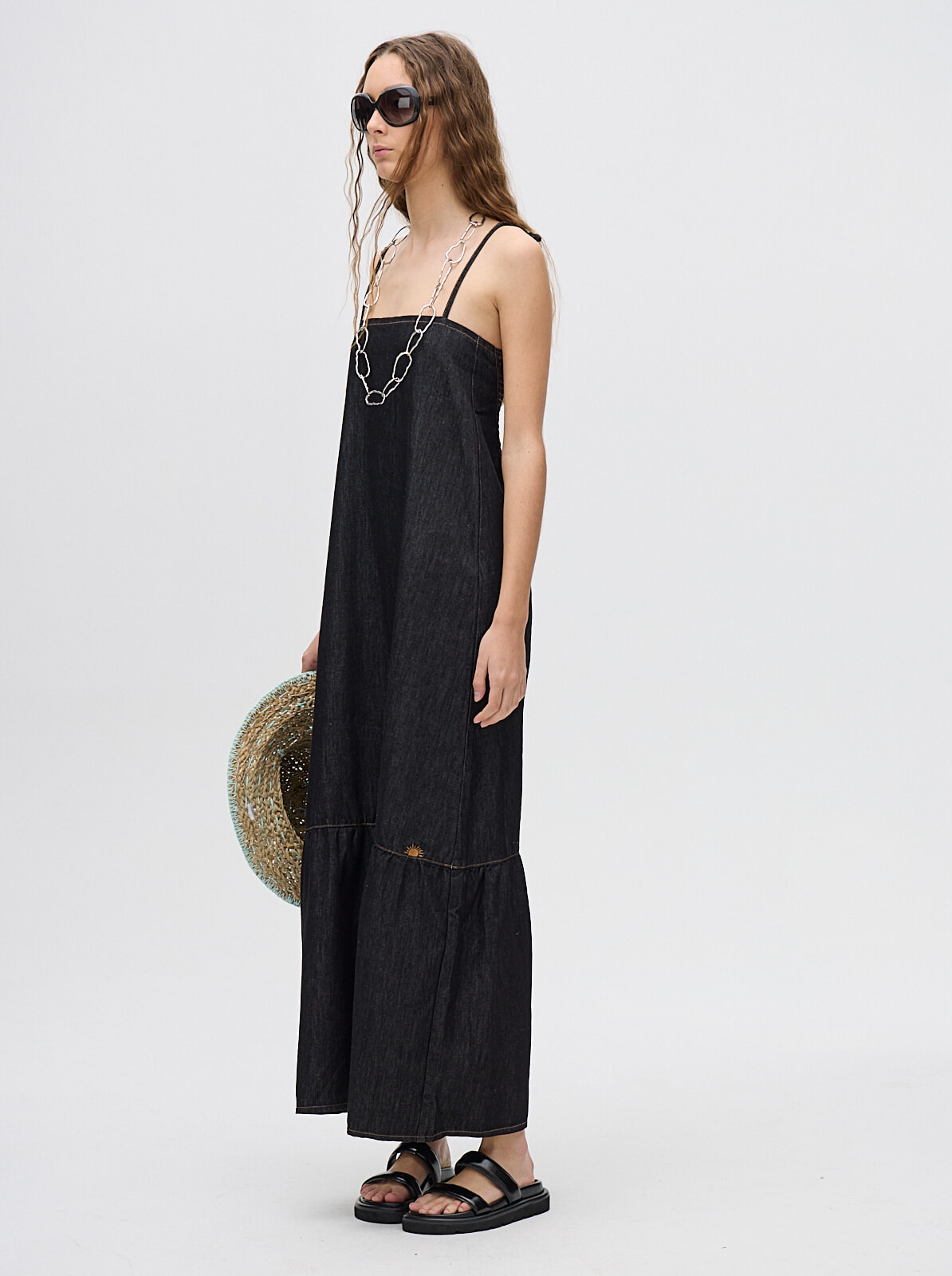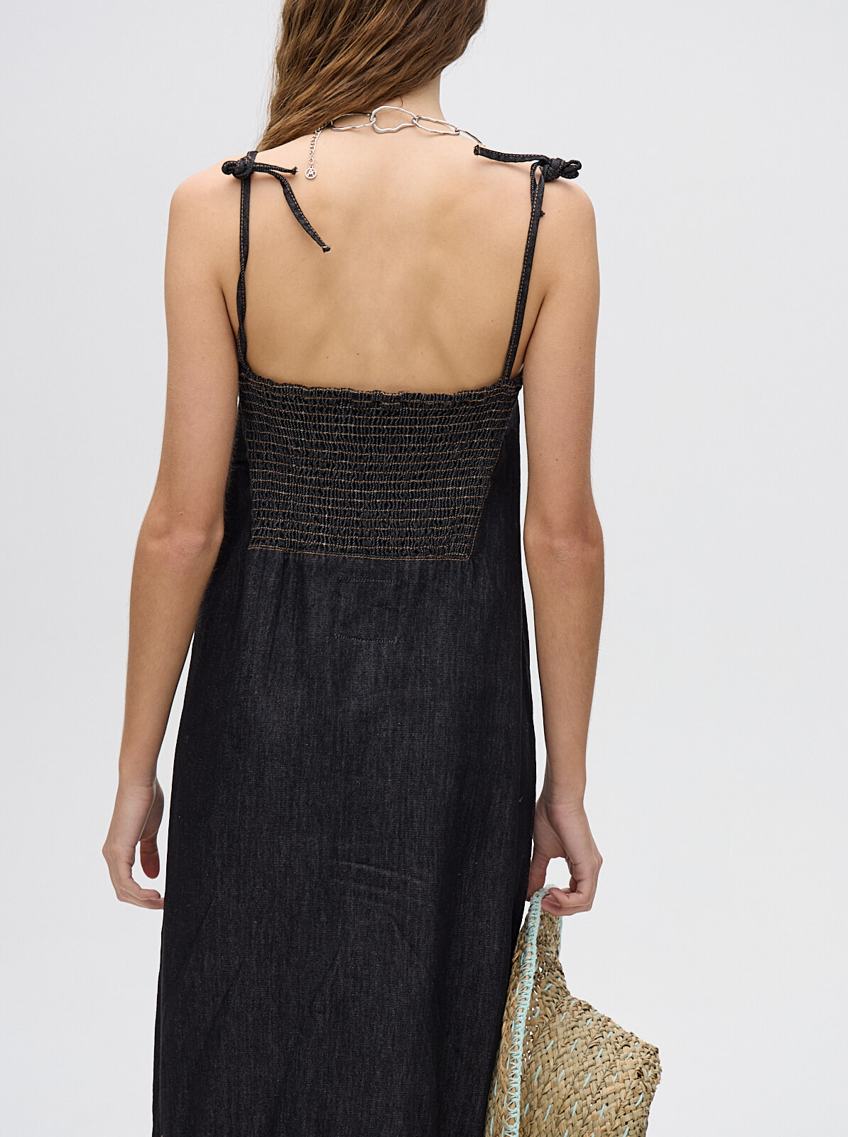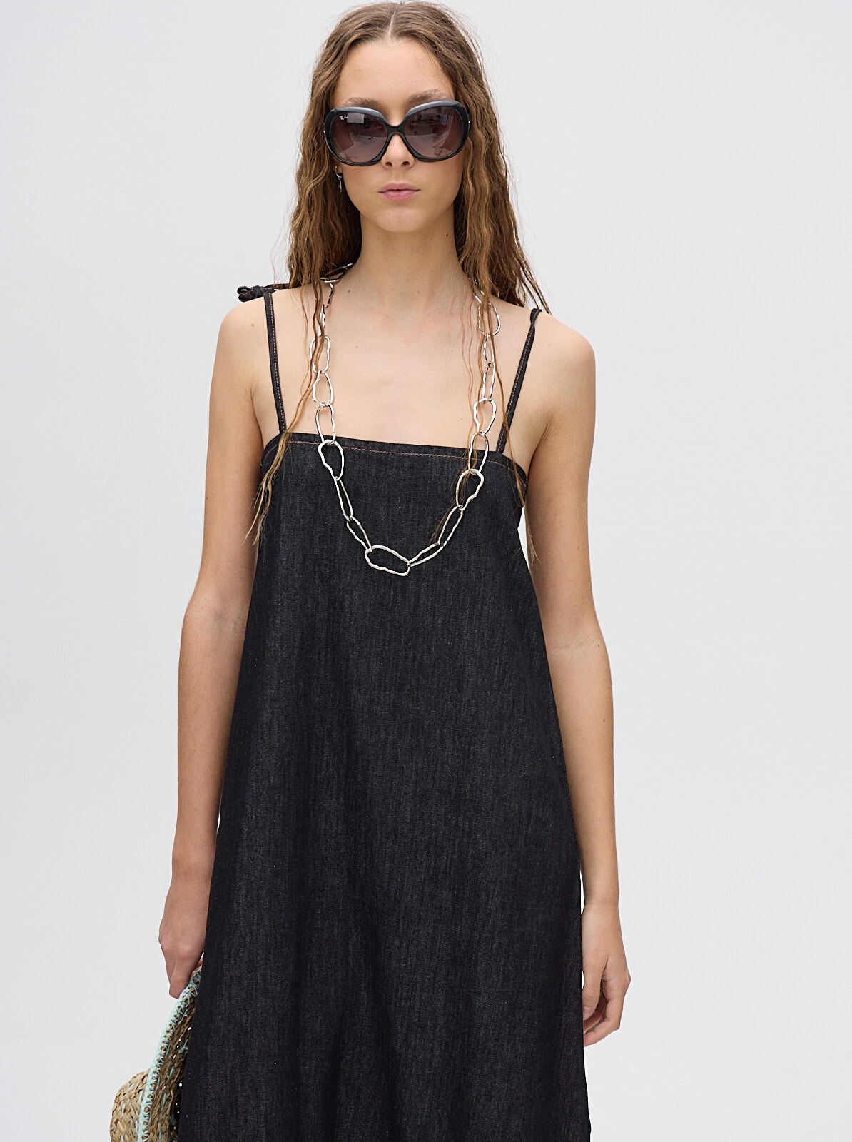 corte midi y lazos ajustables, cae suelto. terminado con semi-pollera en el bajo, detalle de lazos a juego.