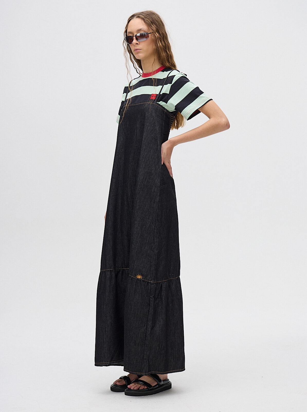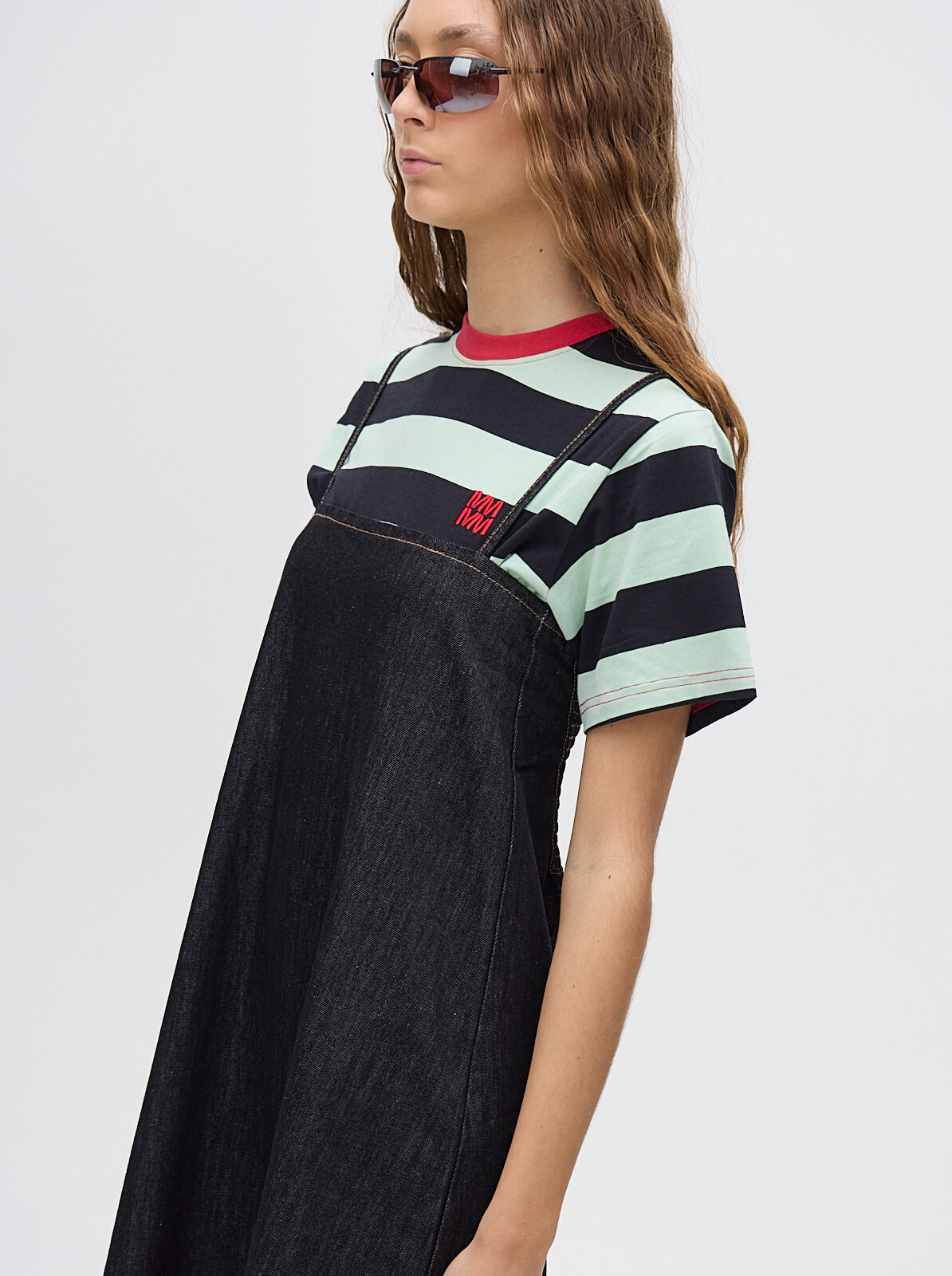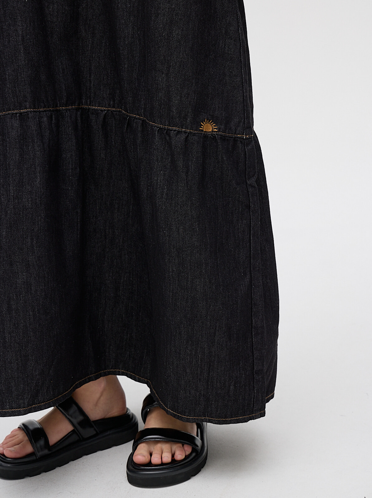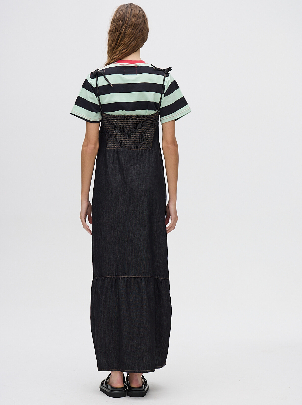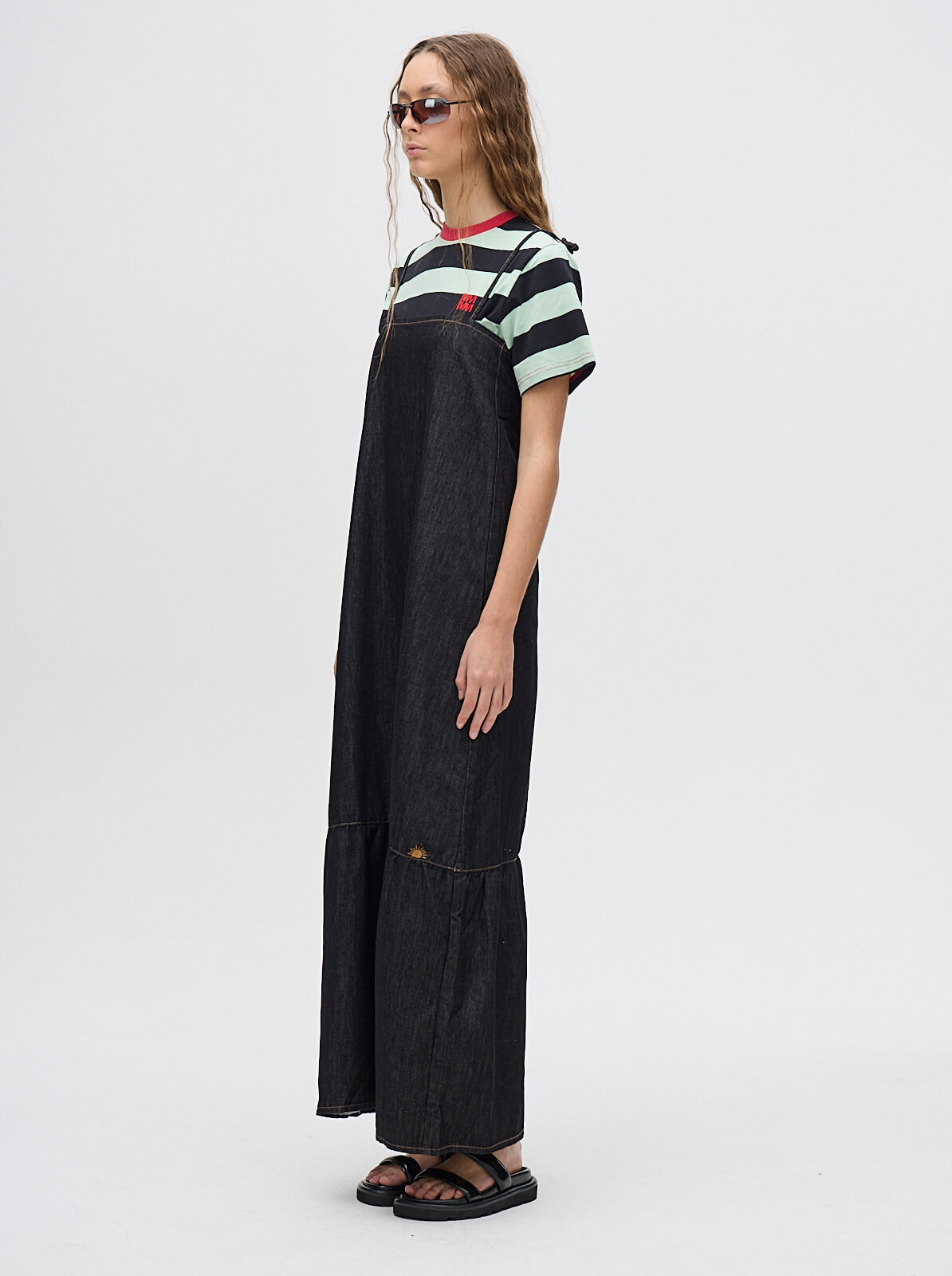 corte midi y lazos ajustables, cae suelto. terminado con semi-pollera en el bajo, detalle de lazos a juego.