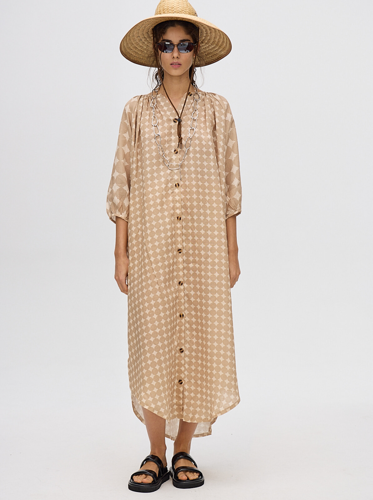 vestido clásico con mangas 3/4 y cuello mao, diseñado en dos patrones de tela vichy con cierre de botones a lo largo
